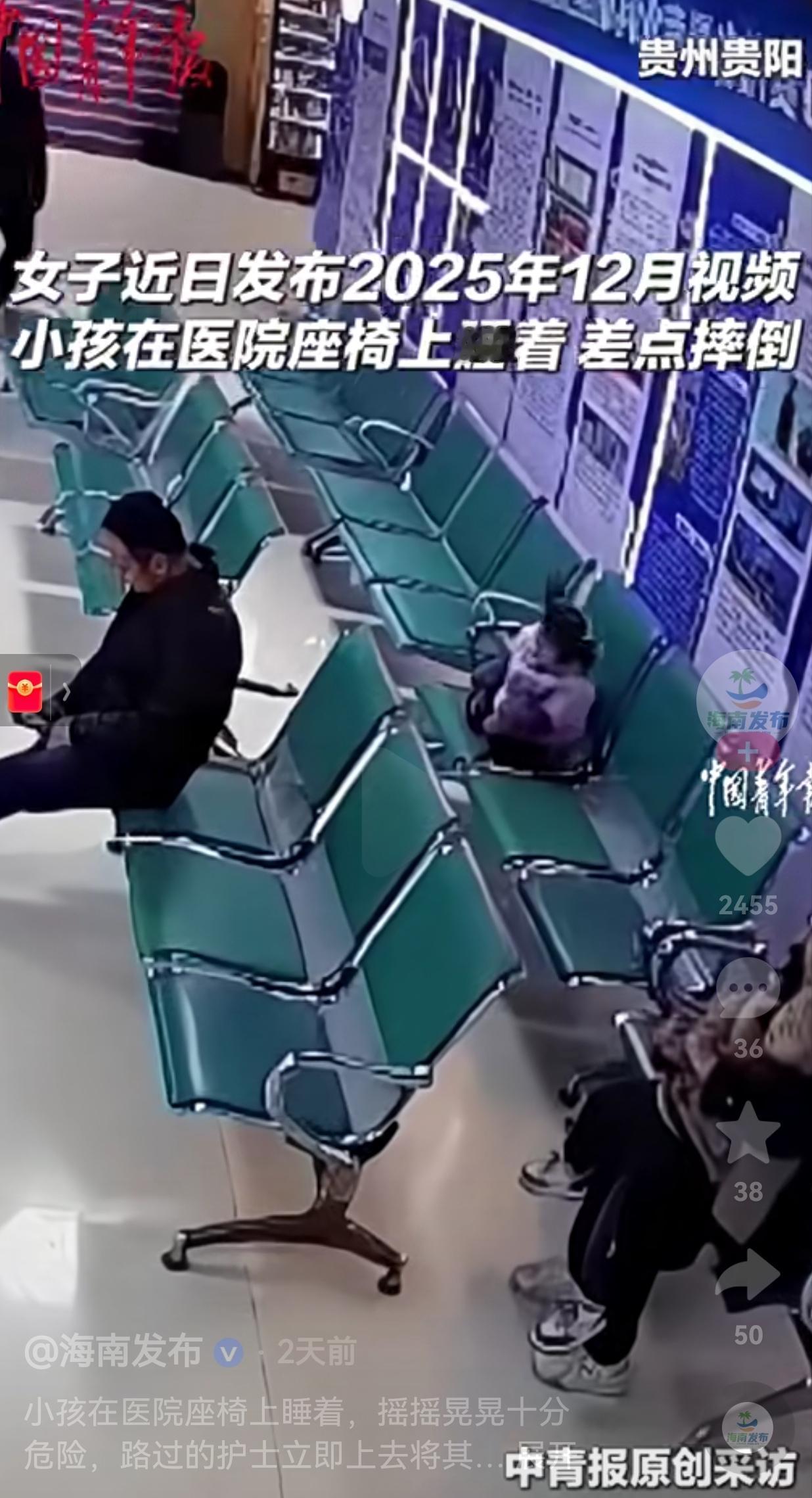 为你点赞!近日,贵州贵阳,一女子发2025年12月份的视频,视频显示,小女孩一个人孤零零地坐在医院的座椅上,好像在等大人回来。 谁知道,小女孩坐着坐着就睡着了,只见她坐在座椅上,不停地点头,身体来回摇晃,不停地东倒西歪,眼看就要摔倒。 就在这千钧一发之际,值班的黄护士路过此地,抬头看到了小女孩的状况,害怕小孩摔倒,造成身体上的伤害。 于是,她快步上前,查看孩子的情况。起初她还以为小孩在玩耍呢?这近前细看,才惊讶地发现孩子不是在玩耍,而是睡着了。 这位护士问了旁边的人:你们知道小孩的家属呢?经过询问,这才得知,小孩子的奶奶去买东西了,让小孩在这里等着。 得知情况后,她就把小孩抱到了护士站睡觉,没过多久,孩子的奶奶就回来了,这才把小孩送到奶奶的手上。 网友看到后评论说:“如果不是这位护士及时看到了孩子的情况,意外真的可能随时出现。” 还有的网友说:“奶奶的心真大,孩子这么小,怎么能让孩子离开自己的视线呢?” 是啊!看孩子的责任很大,小孩子年纪小,一定要看好,有时候一不注意,意外去世真的就发生了。 所以,照顾孩子,一定不能让孩子自己的视线。俗话说:“防患于未然”,只有小心谨慎,才能把伤害扼杀在摇篮里。 当然了,这位护士也值得大家学习,虽然只是一个小小的善举,可是,就是这个行为,让孩子睡得更舒服,也避免了孩子遭受意外伤害。让我们为善良的护士点赞!