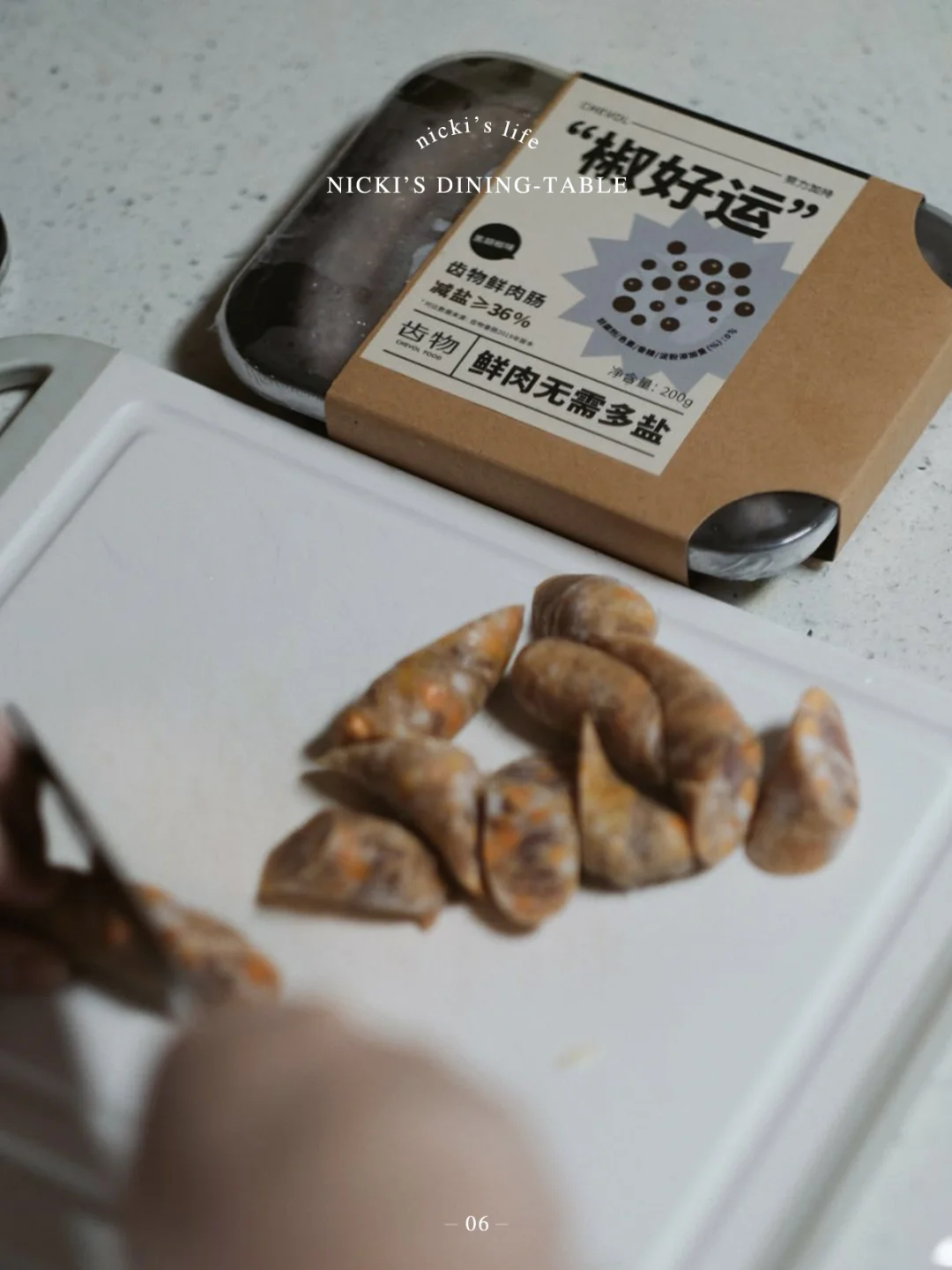 •香肠滚刀切小段。香肠我用的是齿物鲜肉肠的芝士口味,香肠里的芝士粒毫不吝啬,减盐配方的纯冷鲜肉,肉质紧实多汁,浓浓芝士香和黄芥末酱很搭。