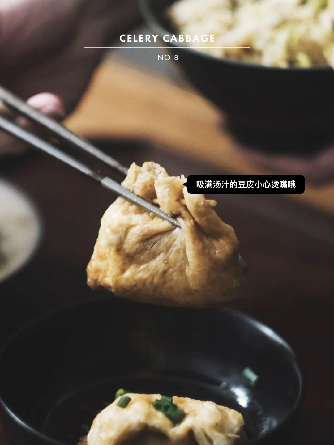 • 白菜洗净切丝,加入一勺盐,腌20分钟后将白菜挤干水分,鸡蛋液和大白菜丝拌在一起,塞进豆皮中,用牙签封口。