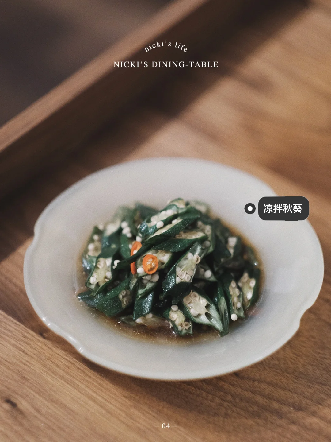 •秋葵洗净,锅中煮水,加盐,汆一下秋葵放冷水中