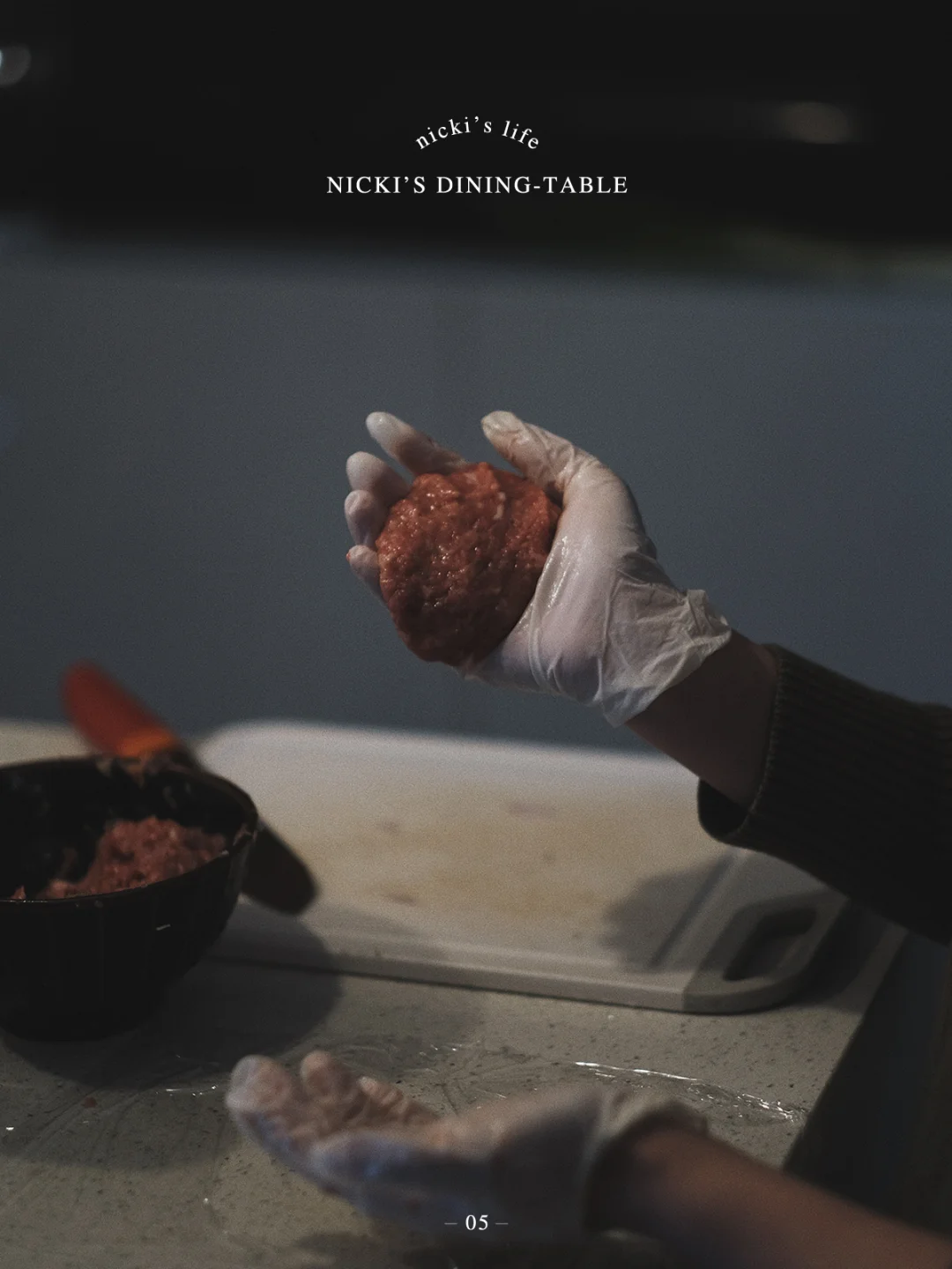 • 接下来是很重要的一步,取一块肉饼的量,左右手进行摔打,我差不多一块肉饼这么摔了100次吧,这样做可以让肉更劲道,肉饼煎起来也不会散开,这一步不要偷懒哦