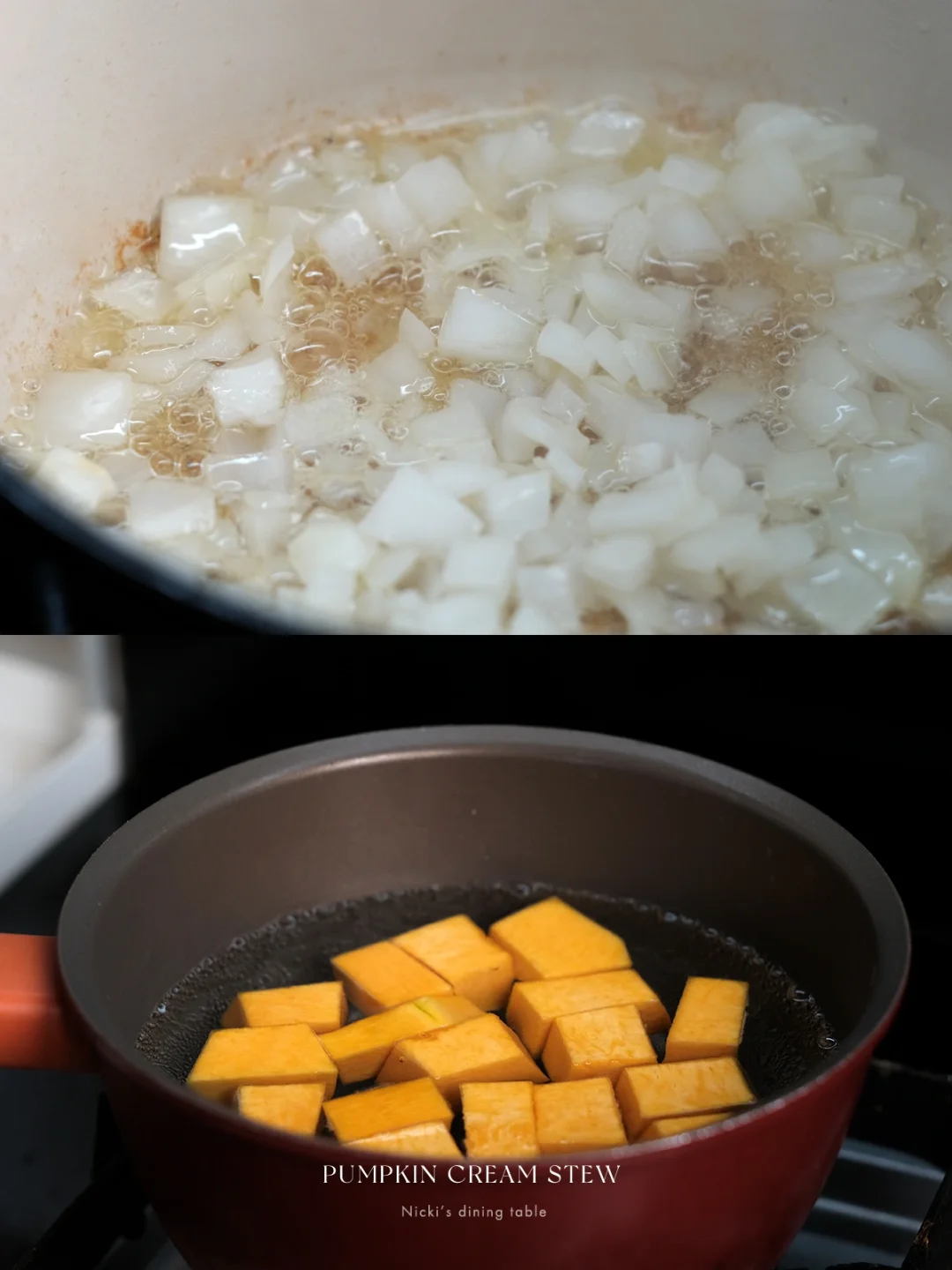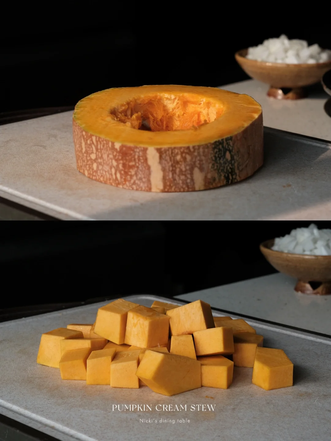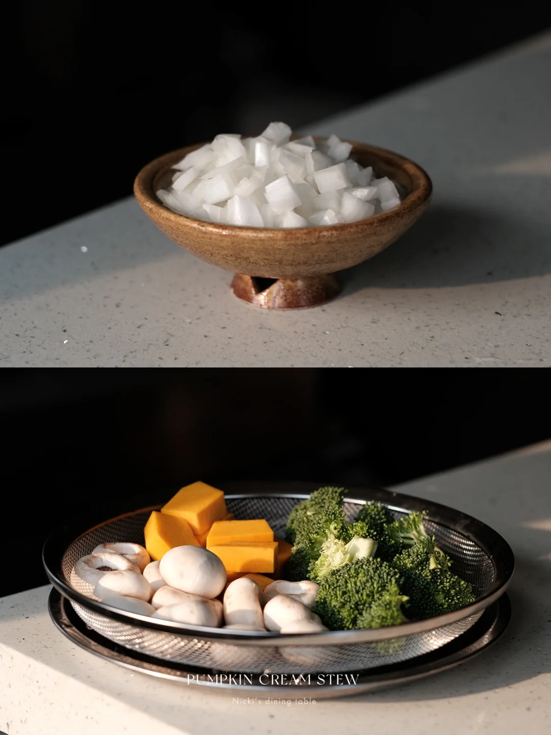 《舞伎家的料理人》里有一道奶油炖菜,这道菜在日本很常见,上海的洋食店里基本也都有。有海鲜搭配时蔬、有鸡肉搭配,但主基调都是以牛奶或淡奶油,今天想在这基础上做个改良,用南瓜浓汤做为基底,浓郁的奶味还透露淡淡的南瓜香。