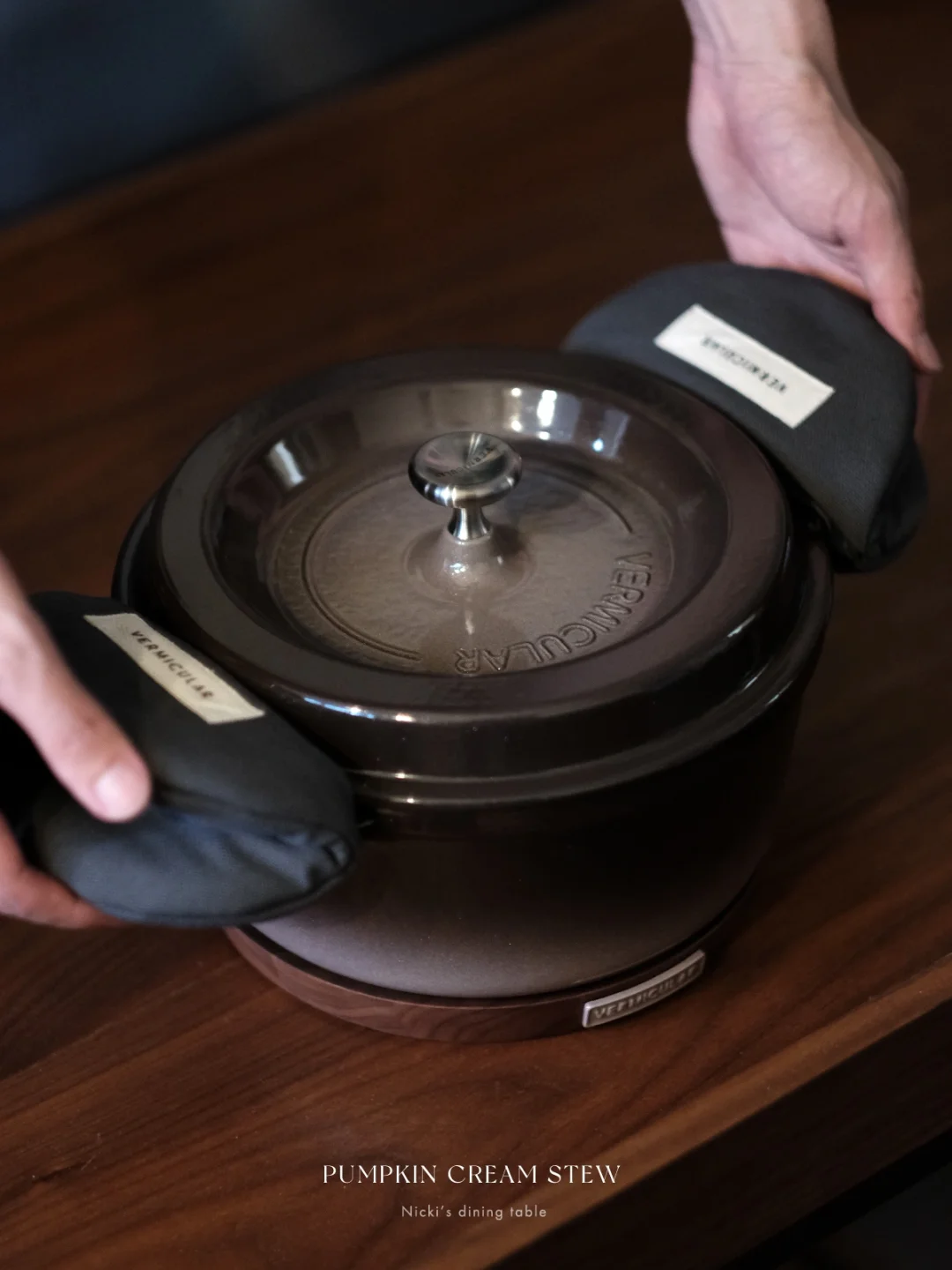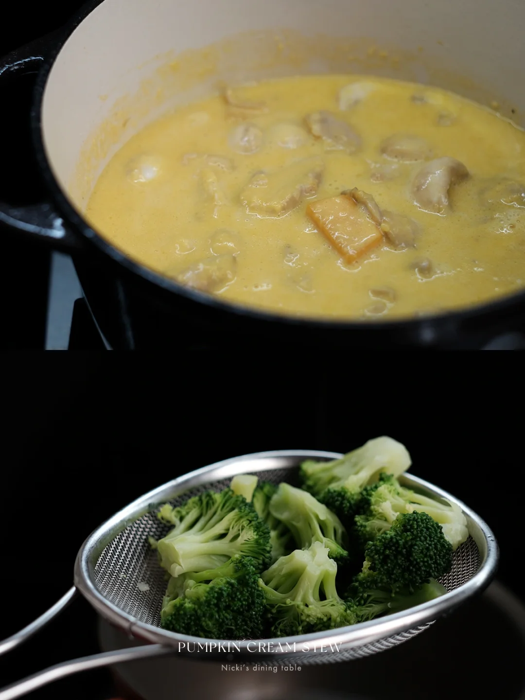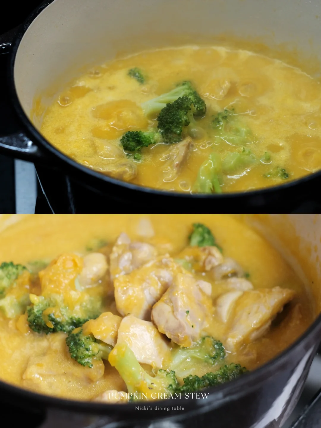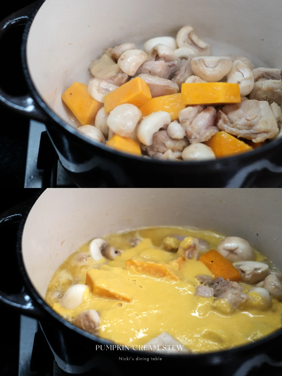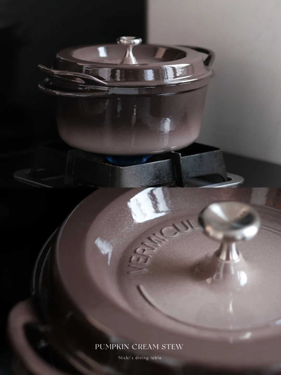 🔺tips:制作的过程中除了加入南瓜浓汤,无须另外加水,这样会降低炖菜的浓度,尽量用气密性高的铸铁锅炖煮,可以牢牢锁住食材原汁原味。