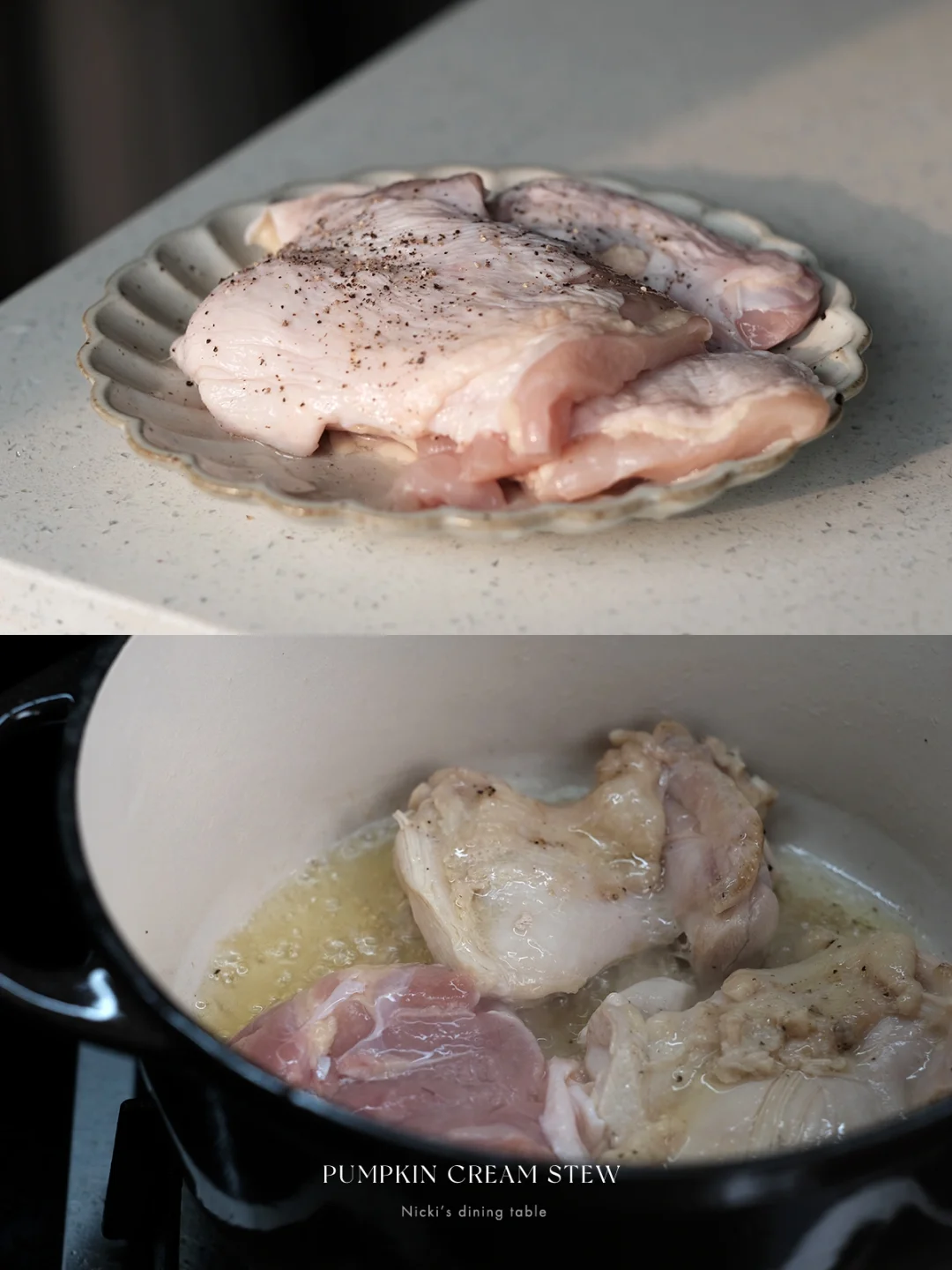 •将蘑菇、剩下的一半南瓜、鸡腿肉一起倒入铸铁锅中,炒至蘑菇缩水,倒入南瓜浓汤,加2-3小勺盐,少许黑胡椒拌匀,盖上锅盖煮10-15分钟。