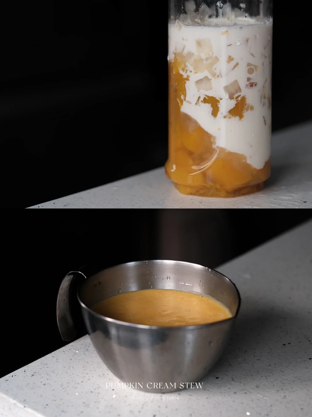 •将洋葱、煮好的南瓜、1大勺煮南瓜的水、半盒淡奶油、1勺面粉放入搅拌机里搅拌成浓汤。