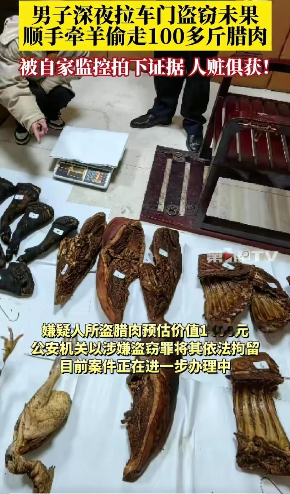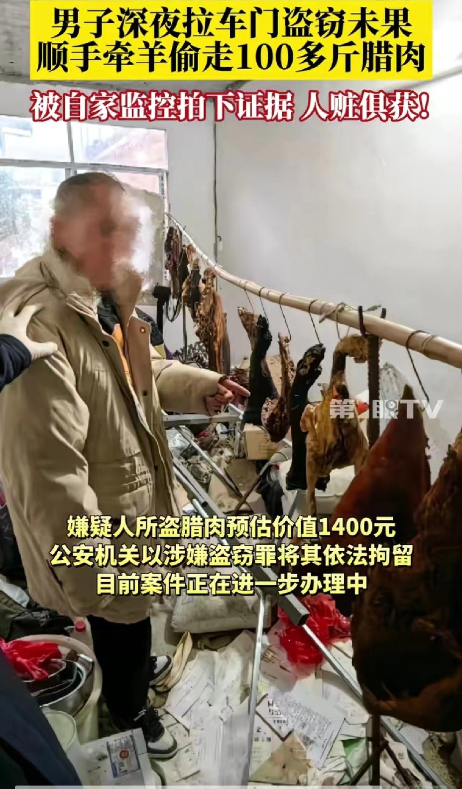 重庆开州温泉镇,发生一件哭笑不得的盗窃案。一户人家刚熏制好的腊肉挂在门外,转眼就不翼而飞,腊肉主人随即报了警。 民警通过监控,发现一位撑着伞的男子行迹可疑,在街上东张西望,拉车门无果后,又上楼搜寻目标。民警在一处私人监控发现他手提2块腊肉,断定此人具有作案嫌疑。 于是民警寻迹追踪到嫌疑人的住址,但面对民警,这名男子却矢口否认,拒不承认偷腊肉的事实。然而,当民警查看了他家监控后,真相瞬间大白——自家监控出卖了他。视频清晰记录着他提着腊肉回来的画面,民警进屋一搜,好家伙,丢失的腊肉挂成一排:7只猪脚,4块肉,整条猪的排骨,还有2只鸡,一样不少。 经查,这些腊肉成本价已达1400多元,该男子当即被警方依法刑事拘留。 原来嫌疑人可不是临时起意,而是一个有多次盗窃前科的惯犯。当天晚上在正是有备而来,拉车门,看看是否有机可乘。上楼寻找作案目标时,发现这家门外挂着许多腊肉,一股腊香让他欲罢不能,于是顺手牵羊,将全部腊肉一扫而空。 此事一出,网友神评频出:“这是空手出门,抱财归家呀”。 “第一次听说自己家安装的监控把自己给抓了,这是自投罗网” “为了价值一千多元钱,弄得全村人都知道,怎么在村里呆?” 依我看,人要脸,树要皮,但对于这种将小偷小摸习以为常的人来说,哪里还有什么脸面可言?被公安机关多次处理仍不知悔改,说明这种伸手的习惯已深入骨髓,想改变恐怕有点艰难。