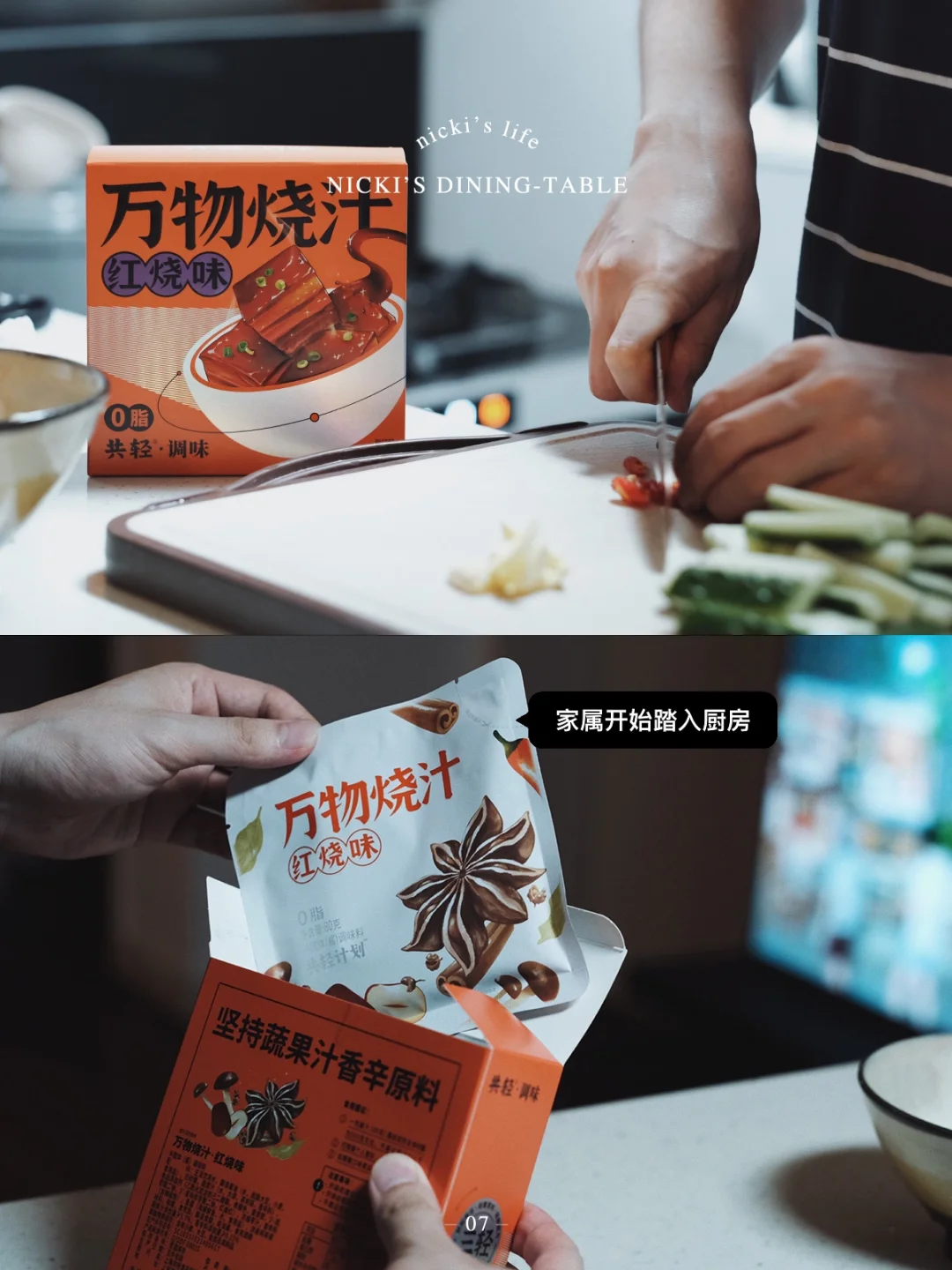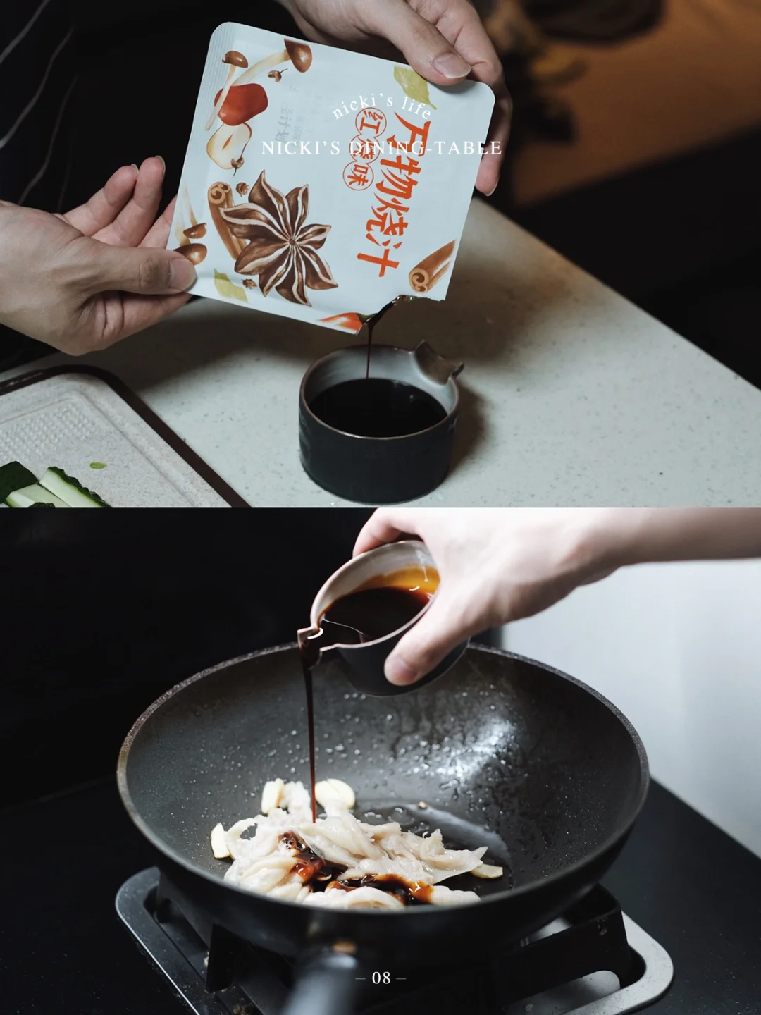 •锅中倒油,放入大蒜4-5瓣,小火炒出香味后放入鸭掌、加入红烧汁,一包的量刚好做一份菜,它0脂0添加防腐剂,融入果蔬汁、香辛料,味道更浓郁,所以无须再加其他任何调料,红烧酱汁是阿拉上海小囡的zui爱,万物皆可用它来烧。