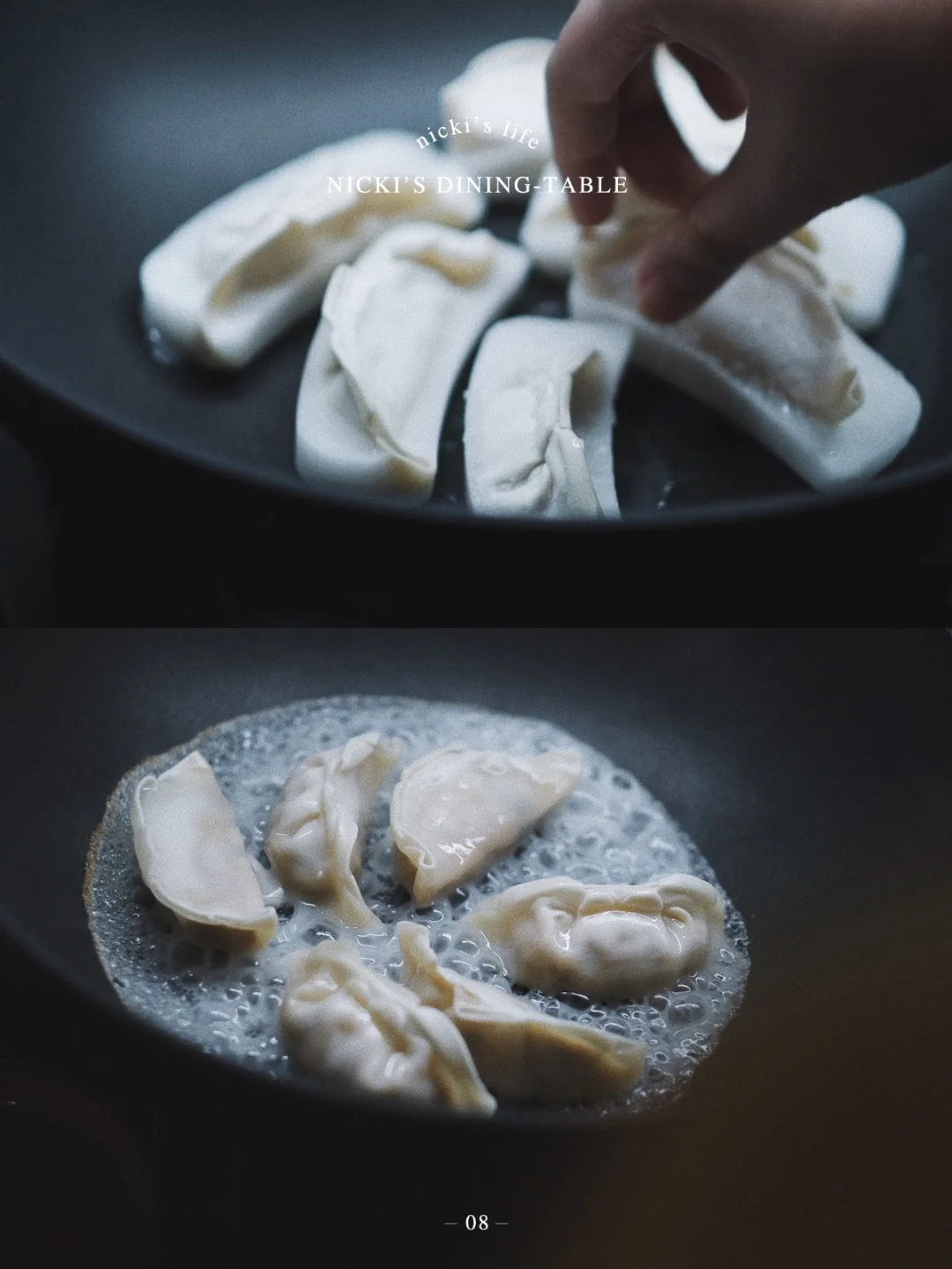 制作简单易操作,参考官方教学视频就可以啦:煎饺放平底锅,盖上锅盖5-6分钟焖煎,之后开盖转动锅底,让其受热均匀,用筷子轻轻夹起煎饺松动一下,调整好就可以拿盘子倒扣出锅了。