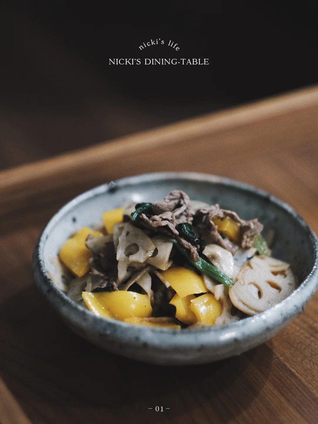 • 牛肉撒少许盐,料酒抓匀腌制20分钟,藕、杏鲍菇切薄片,彩椒切小块。