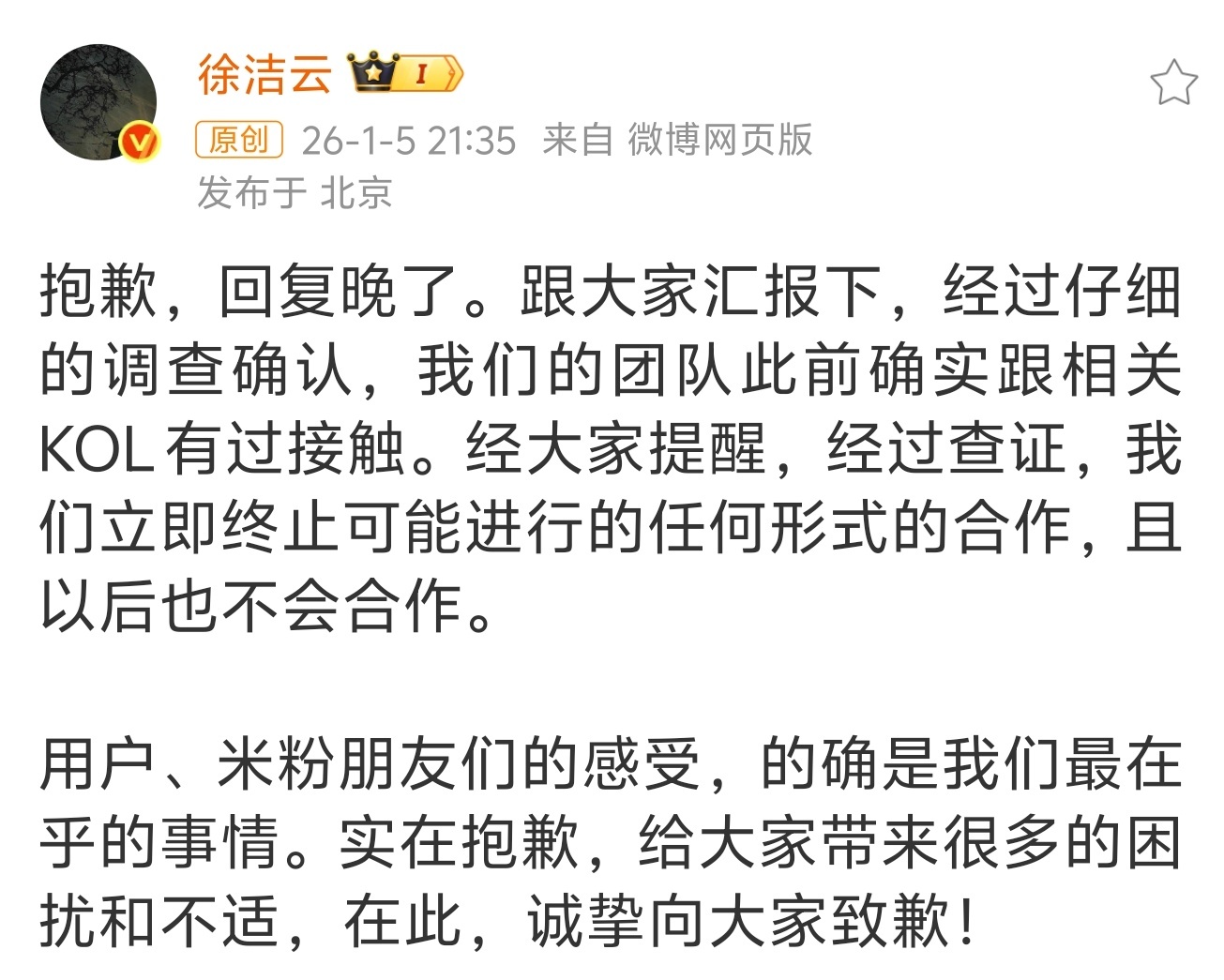 大熊这事真是这样?......看得我半信半疑的我能理解他的动机,双方粉丝互殴,他夹在中间出不来,虽然嘴上是挺硬,但身体一定很老实这个漩涡太大了,不是自媒体能趟的了的,想滑脚跑路也很正常即使这个事是真的,也搞得太着急了;至少要有几年的时间把这些事都冷下来。不仅不能攻击小米,更加不能攻击米粉,不能够搞出群体性的舆情如果他真的欣赏小米的产品,觉得小米现在已经站起来了,那就更加不应该跟米粉群体对着干,因为这些人真金白银的支持才是小米崛起的根本我也是很不喜欢各家粉丝打嘴炮的,真的没啥必要,一致对外多好?但事实摆在这,这么多年的纠缠,不是一两天就能摆平的,只能是大家长期降低烈度,慢慢迎来缓和还是那句话,大家有时候也要理解一下:小米面对的舆情压力是空前的,也是在中国互联网上前所未有的,小米的各个部门都没有啥应对经验,大家也都是摸着石头过河唉,再说不出来个啥了,快速改正就好......