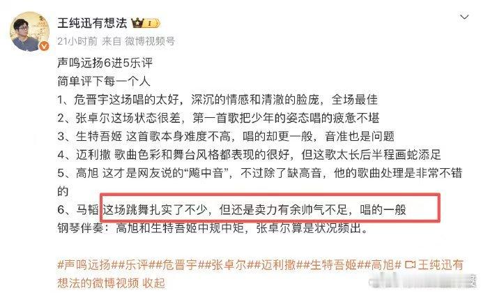 乐评人锐评音综选手卖力但不帅声鸣远扬 新音综热度飙升!马韬投入唱跳《闭嘴跳舞》,乐评人“帅气不足唱功一般”的锐评,直接点燃讨论战火!