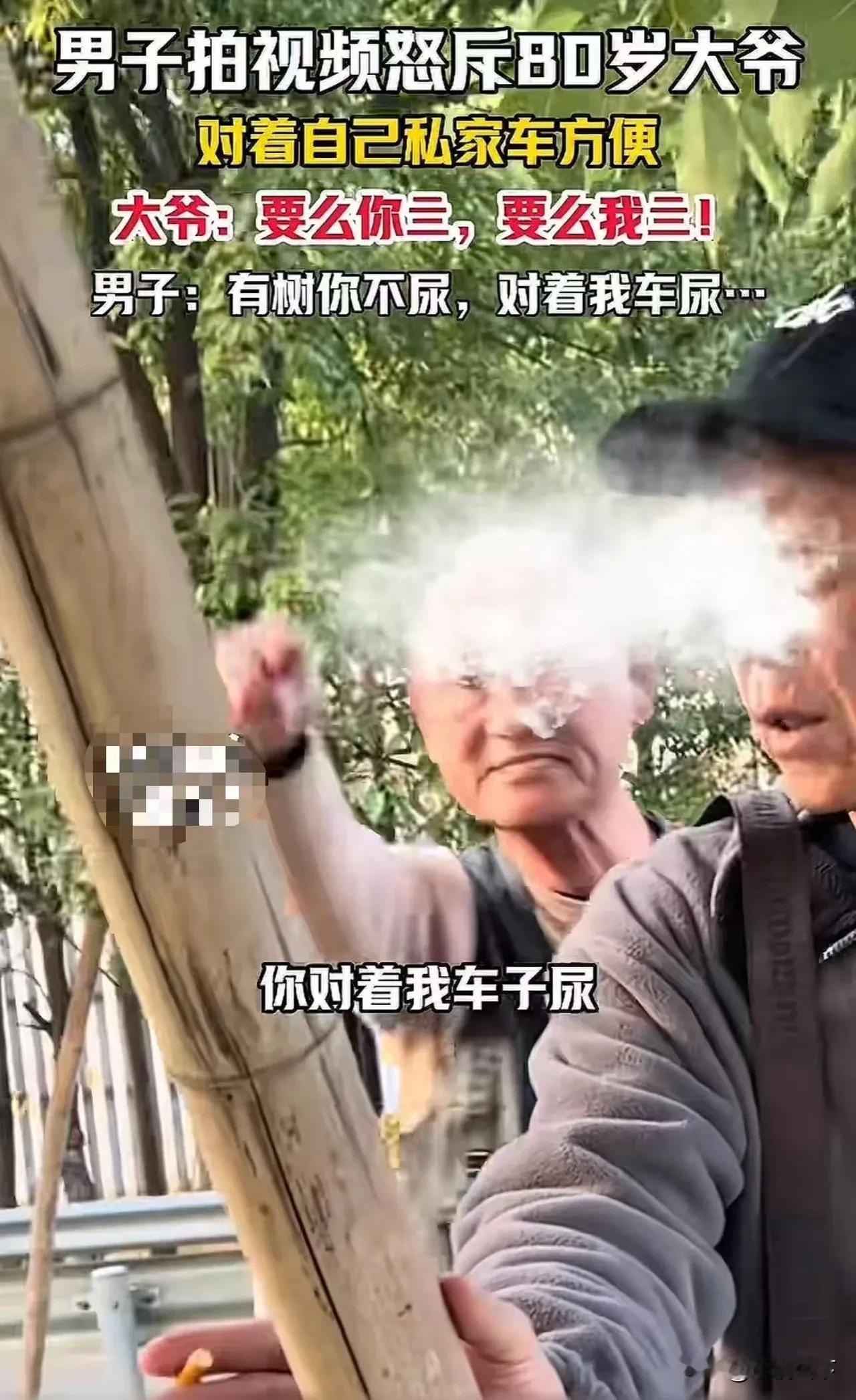 真的是坏人变老了!80岁大爷对着私家车尿尿,放狠话:“要么你死,要么我死!” 男子怒斥80岁大爷对着自己私家车尿尿,大爷却放狠话:“要么你死,要么我死!”男子:“有树不尿,对着我车尿……什么人嘛?”网友:我家狗狗都不会对着人家车尿,都知道找树根…… 监控画面里,大爷颤巍巍走到车旁,旁若无人解开裤腰带时,男子刚买的新车才落地三天。他冲出去制止,换来的不是歉意,而是一句带着狠戾的死亡威胁。 周围围上来的邻居里,有人劝男子“他年纪大了,别跟老人计较”,还有人低声说“忍忍吧,真闹起来你说不清楚”。可男子看着车身上那片刺目的湿痕,只觉得一股寒气从脚底窜上来——这哪里是年纪大了糊涂,分明是揣着明白装糊涂,把“倚老卖老”当成了免罪金牌。 网友的评论戳中了所有人的痛点:“我家狗狗都知道找树根,这位大爷连基本的公德心都没有?”“不是老人变坏了,是坏人变老了!年轻时没教养,老了只会更肆无忌惮。” 更让人寒心的是,当男子提出要报警时,大爷竟然一屁股坐在地上,开始撒泼打滚,嘴里还嚷嚷着“年轻人欺负老人”。明明是自己做错了事,却能理直气壮地颠倒黑白,用年龄当武器,逼着别人退让。 这起事件里,最让人愤怒的从来不是那泡尿,而是某些老人对规则的漠视,对他人权益的践踏。他们把“尊老”当成了特权,却忘了“敬老”的前提,是老人先有值得尊重的品行。 试问,如果今天被尿的是你的车,面对这样的大爷和周围劝和的声音,你会选择忍气吞声,还是据理力争?