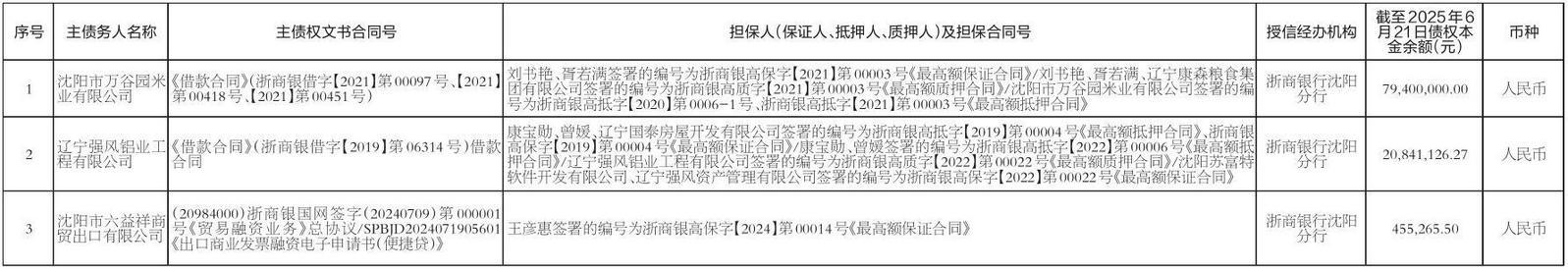 根据浙商银行股份有限公司沈阳分行与中国信达资产管理股份有限公司辽宁省分公司达成的债权转让安排,浙商银行股份有限公司沈阳分行已将其对公告清单中所列主体享有的债权100696391.77元(截至2025年6月21日)转让给中国信达资产管理股份有限公司辽宁省分公司,各债权对应的主债权以及担保合同项下的全部权利也依法转让给中国信达资产管理股份有限公司辽宁省分公司。浙商银行股份有限公司沈阳分行与中国信达资产管理股份有限公司辽宁省分公司特公告通知借款人(主债务人)及担保人及其他相关当事人上述债权转让事实。