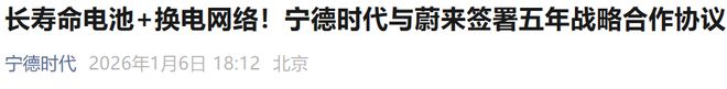 电动知家消息,2026年1月6日,宁德时代官方发布,宁德时代与蔚来在安徽合肥签署为期五年的全面深化战略合作协议。此次合作将围绕技术、生态、市场三大领域展开,致力于打造全球规模最大、技术最领先的乘用车换电服务网络。