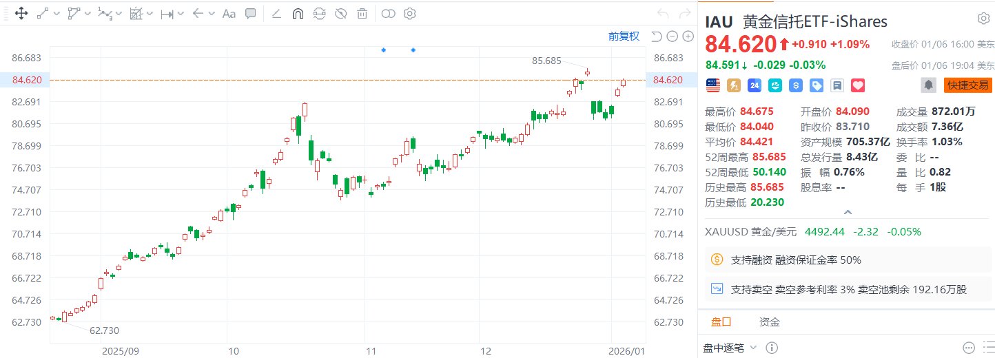 格隆汇1月7日|入选2026年格隆汇“全球视野”十大核心资产的黄金信托ETF(IAU.US)收涨1.09%,报84.62美元。消息面上,周二纽约尾盘现货黄金涨1.07%,报4497.01美元/盎司。紧接着,周三盘初现货黄金继续涨至4500美元/盎司,为逾一周以来首次,距离历史新高仅差50美元。