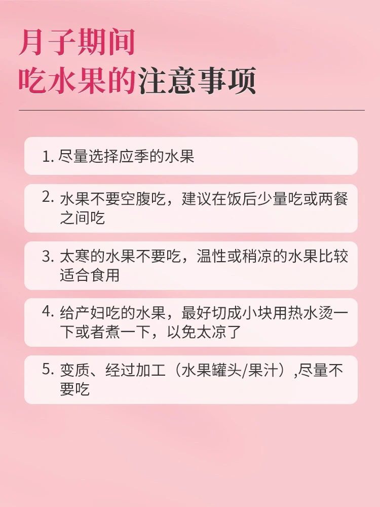 今天我们一起屡屡月子期、孕期该吃哪些水果合适 1⃣️这些水果能【通便】 苹果🍎 香蕉🍌 火龙果 猕猴桃🥝 2⃣️这些水果能【补血】 红枣 樱桃🍒 葡萄🍇 龙眼 3⃣️这些水果能【下奶】 木瓜 橘子🍊 香瓜 4⃣️吃水果的注意事项 1.尽量选择应季的水果 2.水果不要空腹吃,建议在饭后少量吃或两餐之间吃 3.变质、经过加工(水果罐头/果汁),尽量不要吃 4.太寒的水果不要吃,温性或稍凉的水果比较适合食用 5.给产妇吃的水果,最好切成小块用热水烫一下或者煮一下,以免太凉了