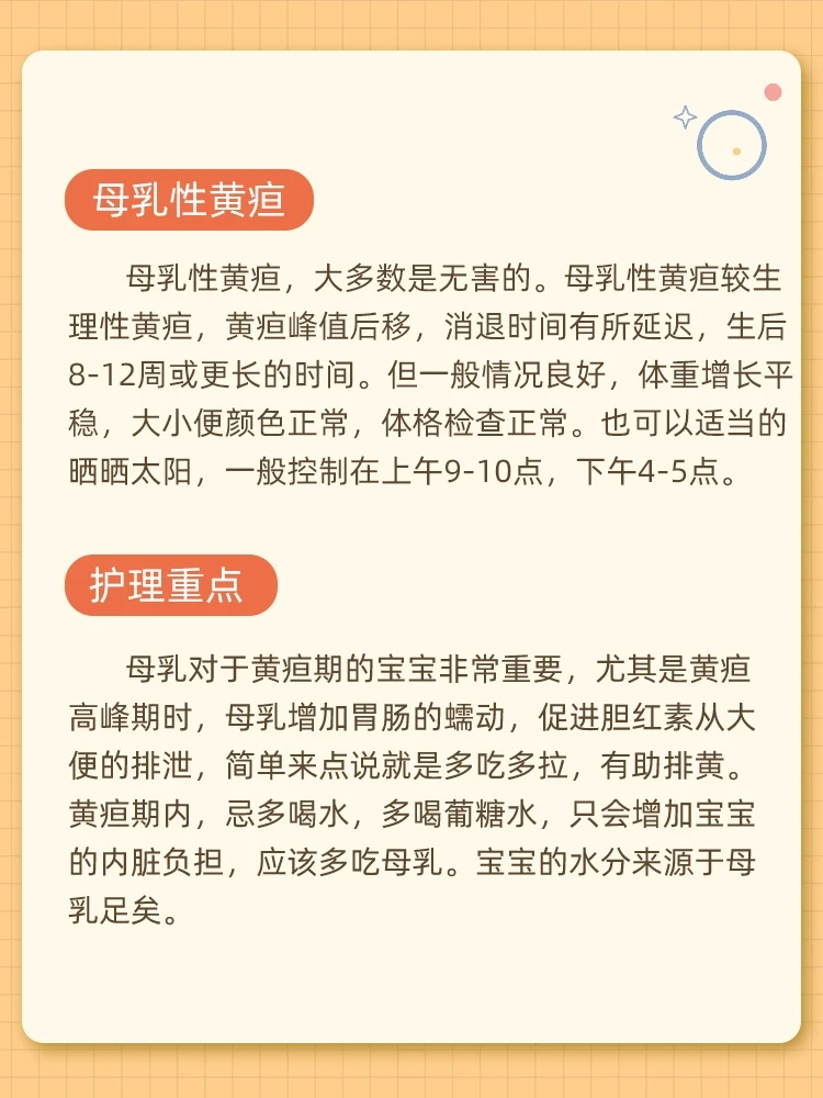 3⃣️母乳性黄疸特点:大多数是无害的,只要宝宝有正常吃奶,体重增长正常、大小便颜色正常。只要多吃,多拉。也可以适当的晒晒太阳,黄疸就会逐渐消失。