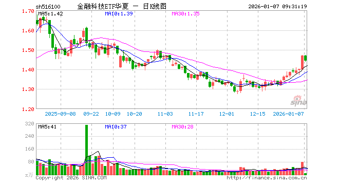 1月7日,金融科技ETF华夏(516100)开盘涨0.07%,报1.470元。金融科技ETF华夏(516100)重仓股方面,同花顺开盘跌1.99%,东方财富跌0.92%,指南针跌2.13%,恒生电子跌0.22%,润和软件跌0.21%,东华软件涨0.32%,银之杰跌1.72%,新大陆涨0.04%,广电运通涨0.07%,大智慧涨1.56%。