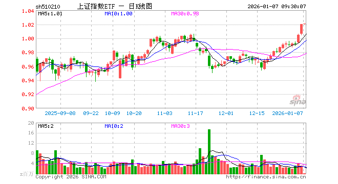 1月7日,上证指数ETF(510210)开盘涨0.00%,报1.020元。上证指数ETF(510210)重仓股方面,农业银行开盘跌0.26%,贵州茅台涨0.34%,中国石油跌1.17%,工业富联跌1.00%,恒瑞医药跌0.08%,三一重工涨0.00%,紫金矿业涨0.00%,中国银行跌0.18%,招商银行涨0.05%,邮储银行跌0.18%。