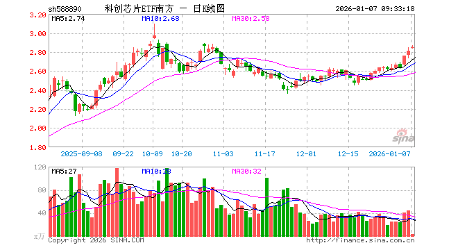 1月7日,科创芯片ETF南方(588890)开盘涨0.96%,报2.836元。科创芯片ETF南方(588890)重仓股方面,海光信息开盘涨0.00%,澜起科技涨5.60%,中芯国际涨0.00%,寒武纪跌0.95%,中微公司涨3.10%,芯原股份涨2.82%,华虹公司涨4.09%,沪硅产业涨2.12%,华海清科涨2.41%,晶晨股份涨0.01%。