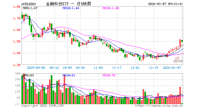 1月7日,金融科技ETF(516860)开盘跌0.46%,报1.509元。金融科技ETF(516860)重仓股方面,同花顺开盘跌1.99%,东方财富跌0.92%,指南针跌2.13%,恒生电子跌0.22%,润和软件跌0.21%,东华软件涨0.32%,银之杰跌1.72%,新大陆涨0.04%,广电运通涨0.07%,大智慧涨1.56%。