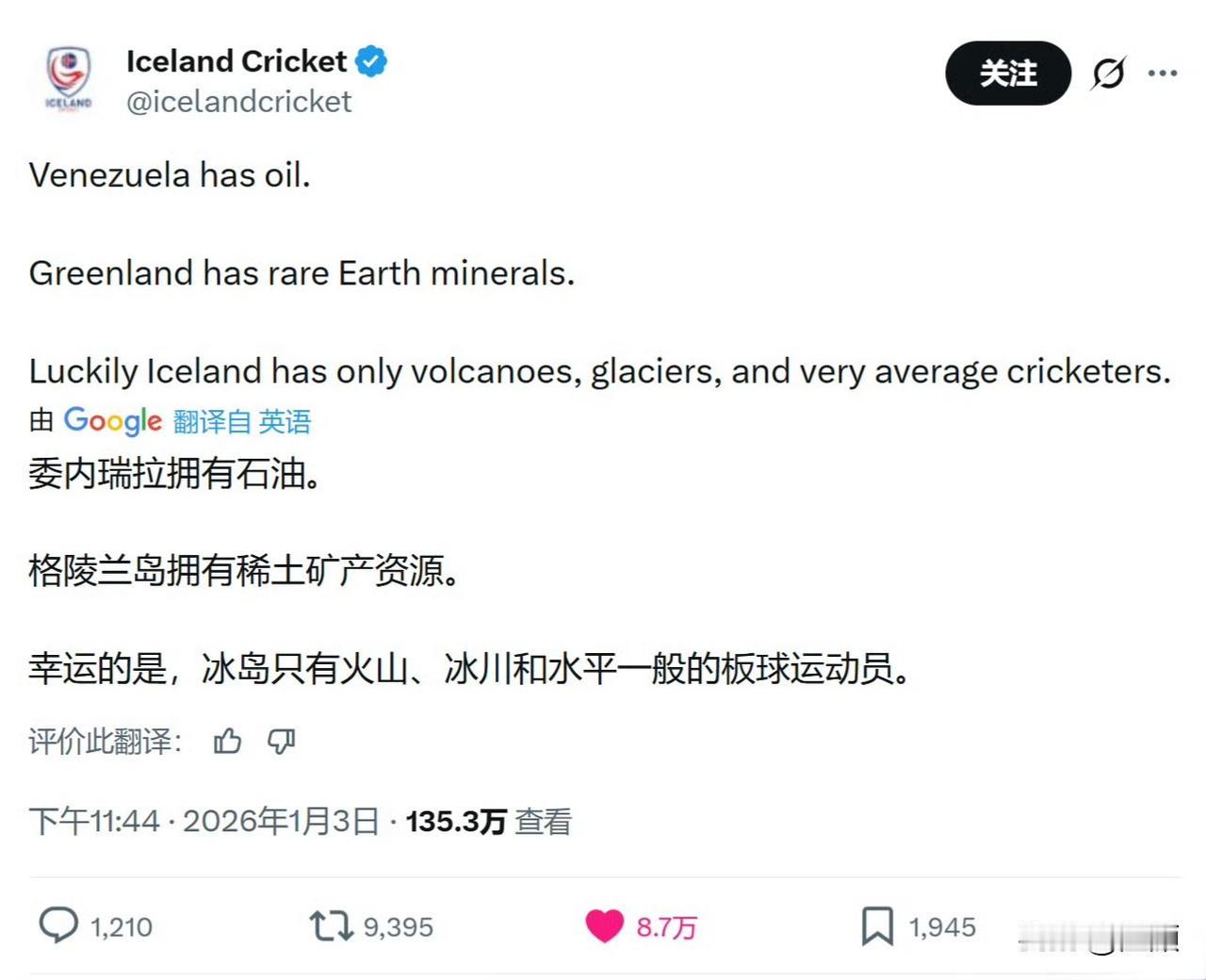 冰岛板球协会官方X账号发文: 委内瑞拉有石油,格陵兰岛有稀土。 幸运的是:冰岛只有火山、冰川和水平一般的板球运动员(潜台词:我们不用担心被美国侵略) 黑得漂亮,X平台瞬间200多万阅读,评论区满是“冰岛安全,因为没资源可抢”的调侃,成为反美霸权的幽默名场面 。 网友:建议冰岛板球水平再降点,彻底断了美国念想
