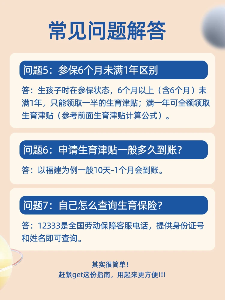 福利是越来越好💰,但是很多人却还不知道怎么用生育保险。其实很简单!今天来系统的讲讲怎么领取这笔补贴。具体看图👆 (划重点) 1⃣️生育津贴领取条件 生育保险连续缴满6个月或一年 2⃣️生育津贴计算方法 生育津贴=单位年度的月平均工资/30天x产假天数 (可看图3) 3⃣️生育津贴详细资料请看图4 4⃣️常见问题可看图5、6