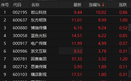 上证报中国证券网讯1月7日早盘,短剧互动游戏概念股拉升,截至9时46分,岩山科技、东方明珠涨停,博瑞传播接近涨停,蓝色光标、电广传媒等跟涨。