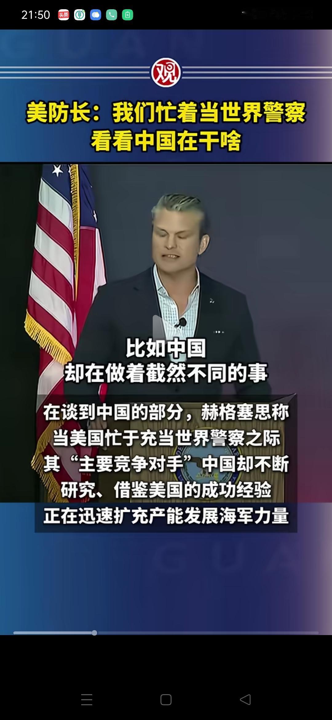 美国防长赫格塞思总是“念念不忘中国”,不说中国,他就不会说话。 赫格塞思在造船厂发表演讲说,美国要重建“绝对威慑力”,强大到让敌人“不敢”试探美国。紧接着谈论中国,当美国忙于充当世界警察之际,其“主要竞争对手”中国却不断研究、借鉴美国的成功经验,正在迅速扩充产能发展海军力量。真不知羞耻,什么“世界警察”,其实,就是世界强盗,而且自己都不加遮掩了! 这个世界,对于中国来说,最大也是最危险的敌人就是美国。美国把在委内瑞拉的“精彩演出”,看成是至高无上的荣誉,炫耀给中国看,说什么“中国借鉴美国的成功经验”。我们中国不想当强盗、土匪,我们不学习美国的卑鄙无耻,我们走的是光明大道! 赫格塞斯 赫格塞思说“中国要借鉴美国经验” 美国把中国定义为竞争对手