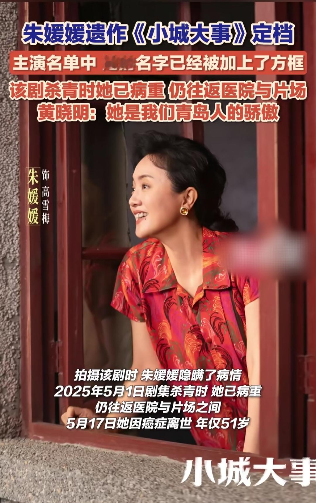 你见过为了一部戏,把病房当休息室的演员吗?杀青那天她瘦得脱了形,却对着镜头笑得格外亮,没人知道她刚从医院输完液,就赶去片场完成最后一场戏——这就是朱媛媛,《小城大事》里藏着她最动人的倔强。 这部定档的遗作,是她用生命完成的告别。病重时往返医院与片场,每一个镜头都带着身体的疲惫,却看不出丝毫敷衍。她不是在演角色,是把自己的赤诚揉进了故事里。 演艺圈总说敬业,可朱媛媛让我们懂了,真正的敬业从不是口号,是明知难以为继,仍不愿辜负每一份期待。她用最后的时光告诉我们:热爱能抵岁月漫长,更能扛过生命的重量。这部《小城大事》,是她留给观众最珍贵的礼物,也是对演艺事业最深情的告白。