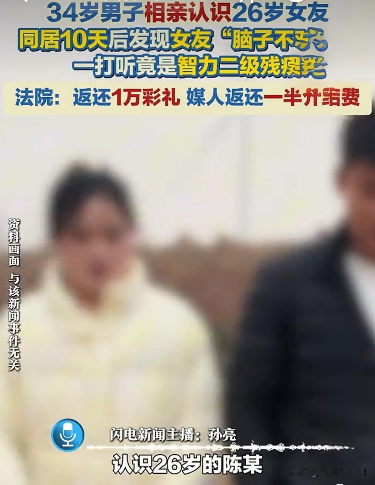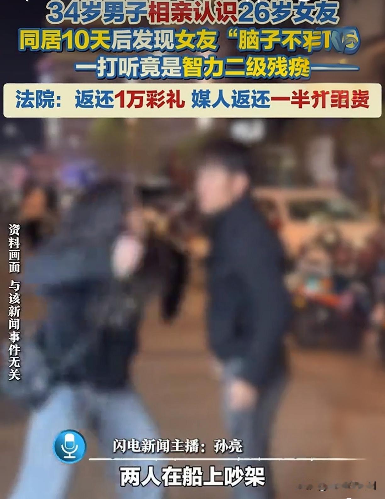 同居10天就闹翻!付2万彩礼发现新娘是智力残疾,法院判退钱,媒人还栽了! 刚同居10天,媳妇竟把他手机眼镜全扔进了长江!一查真相,男子彻底崩溃:媒人介绍的26岁姑娘,竟是智力二级残疾,婚前一个字都没提! 这事放谁身上不憋屈?34岁的李某,经媒人一张巧嘴撮合,认识陈某后迅速订婚,掏出2万彩礼+4000介绍费,满心欢喜迎新娘进门。结果同居第十天,两人在船上吵架,陈某一把抓起李某的手机和眼镜,“噗通”全扔进了长江!李某傻眼了:这哪像正常人干的事? 第二天,他忍无可忍把陈某送回娘家,左打听右打听,整个人如坠冰窟——女方是智力二级残疾,媒人从头到尾瞒得死死的!花了2.4万,娶回来一场骗局,李某气得直接告上法庭。 两场官司,一打一个准。法院一看:女方家庭隐瞒残疾事实,判退还1万彩礼;媒人王某更绝,没资质、不说实话,光收钱不担责,判退回2000介绍费。判决一下来,不少网友直呼解气:专治黑心媒人! 但这背后藏的雷,多少人踩过?相亲时,媒人把对方夸成一朵花,什么老实懂事、勤俭持家,可关键的健康状况、家庭背景,全靠一张嘴。等你交了钱、定了亲,才发现货不对版,那时候维权费时费力,还伤感情。 所以啊,相亲不是逛菜市场,看中了就付钱。关键信息,必须自己多长个心眼:对方身体有没有隐疾?家庭是否和谐?最好侧面多打听,甚至一起出去旅游几天,细节见真人。别等到结了婚、生了气,才后悔“当初怎么没多问一句”。 都说媒人是“牵红线”,可现在不少媒人眼里只剩“牵钱线”。你以为她真心为你好,其实她只想赚快钱。这件事最扎心的还不是被骗钱,而是:人与人之间最基本的诚信,在相亲市场上居然成了奢侈品。 你遇到过相亲隐瞒实情的情况吗?你会怎么核实对方真实信息? 点赞转发,提醒身边人:相亲千万条,核实第一条!