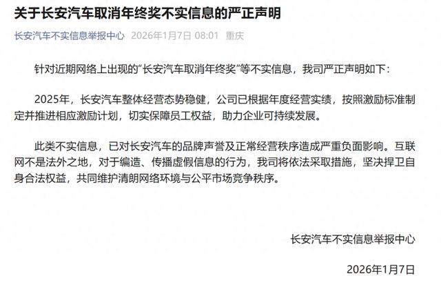 针对近期网络上出现的“长安汽车取消年终奖”等不实信息,长安汽车1月7日发布声明称,2025年,长安汽车整体经营态势稳健,公司已根据年度经营实绩,按照激励标准制定并推进相应激励计划,切实保障员工权益,助力企业可持续发展。对于编造、传播虚假信息的行为,公司将依法采取措施,坚决捍卫自身合法权益。