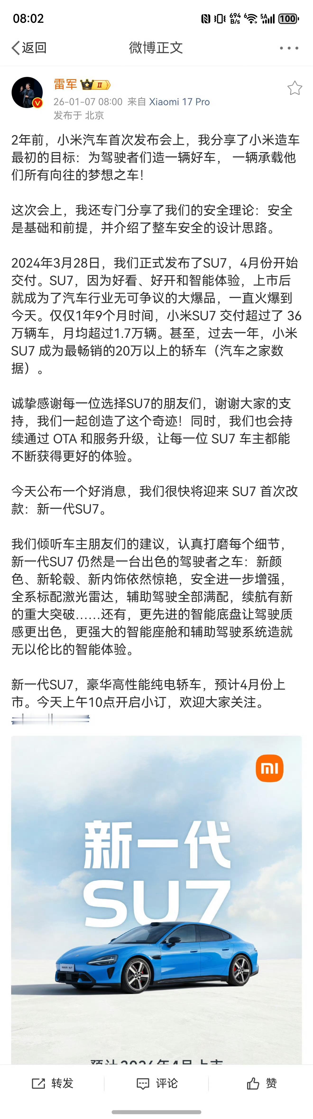 新一代SU7 一大早小米汽车销售就发了消息,说新款小米SU7开启预售了看了下比现款贵了1-1.4万。外观换上了卡布里蓝车漆,换了新样式轮毂,后轮轮胎也加宽了;内饰也有全新配色了。核心配置提升更明显,现款入门款没有的激光雷达,现在全系都标配,算力还提到了700TOPS;安全方面加了两个气囊,防撞梁强度更高,还多了门锁后备电源。动力平台升级后,Pro版续航能到900多公里,Max版充电速度也更快,Pro车型还配上了以前只有Max才有的双腔空悬。没有花里胡哨的东西,都是刚需配置升级。纠结现款和新款的,或者老车主想升级的,你们在考虑买买买了没?