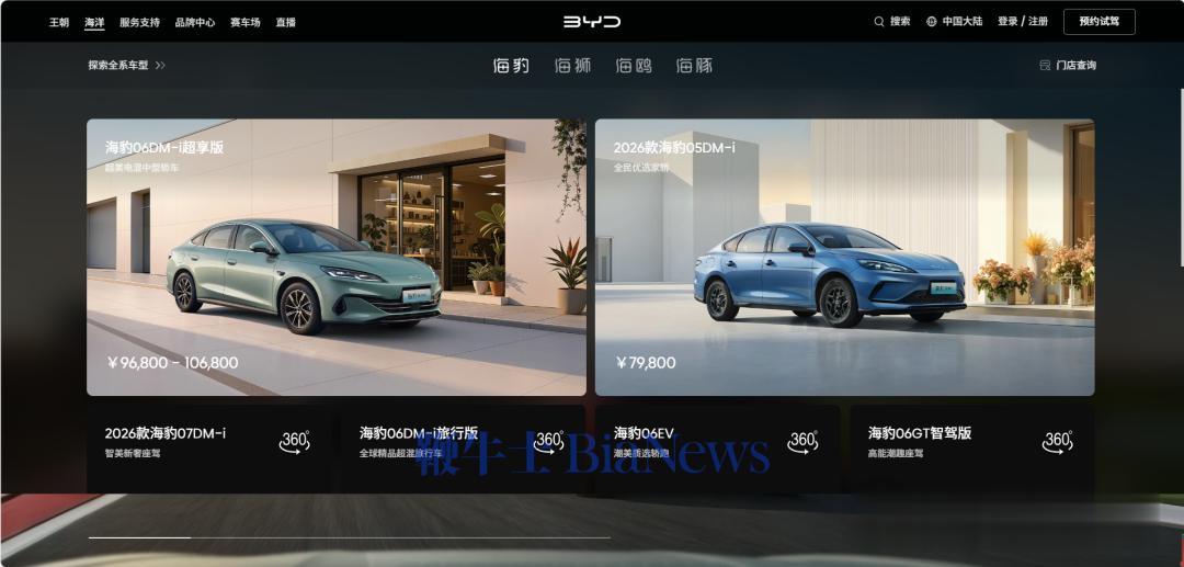比亚迪官网显示,海洋网当前产品序列涵盖海豹、海狮、海鸥及海豚系列,全系车型均以海洋生物命名。
