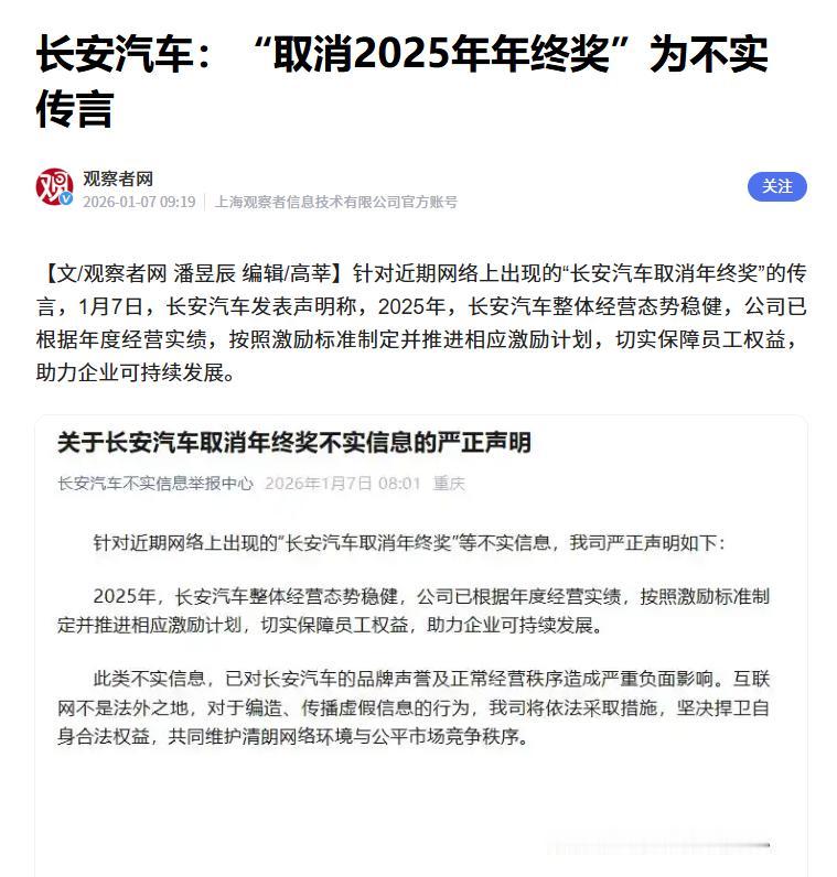 回应来了! 针对此前热传的“取消年终奖”传闻,长安汽车近期表示此为不实信息,公司