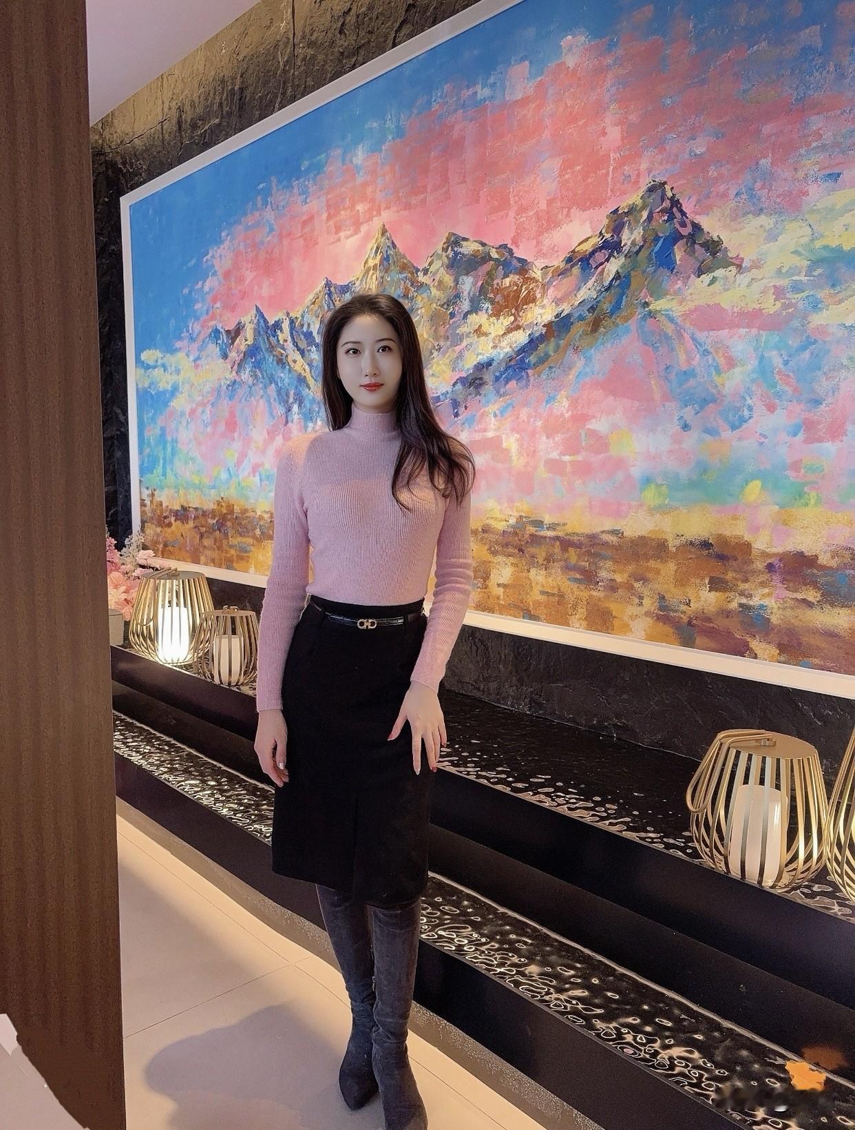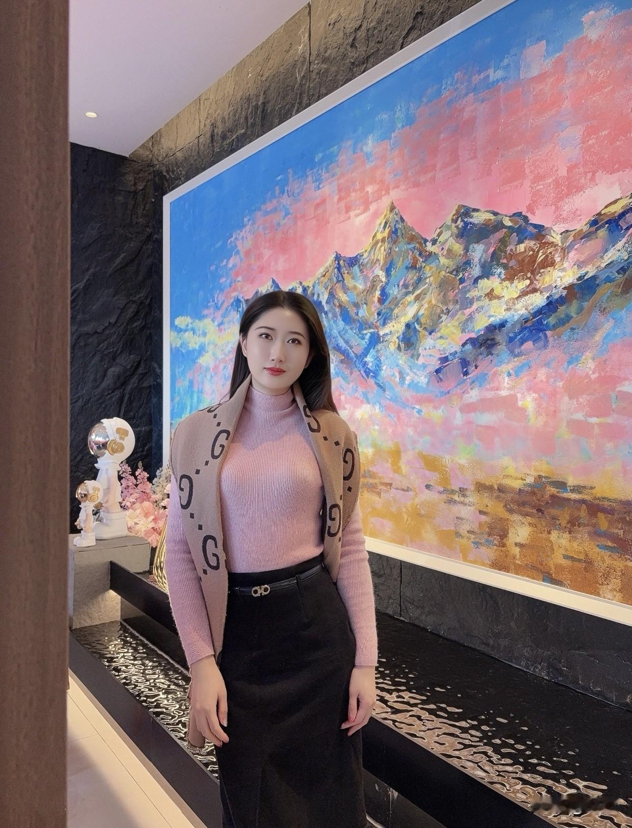 怎么穿搭会让人比较显温柔优雅气质穿搭,粉色毛衣搭配黑色长裙,艺术画作背景,尽显时尚品味。