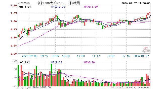 1月7日,截止午间收盘,沪深300成长ETF(562310)涨0.19%,报1.055元,成交额1489.42万元。沪深300成长ETF(562310)重仓股方面,宁德时代截止午盘跌0.87%,贵州茅台跌0.13%,紫金矿业跌1.22%,新易盛涨1.09%,中际旭创涨2.54%,立讯精密跌1.25%,恒瑞医药涨1.93%,比亚迪跌1.44%,药明康德涨2.24%,五粮液跌0.46%。