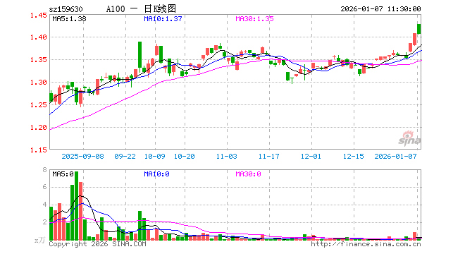 1月7日,截止午间收盘,A100ETF汇添富(159630)跌0.07%,报1.406元,成交额12.06万元。A100ETF汇添富(159630)重仓股方面,宁德时代截止午盘跌0.87%,贵州茅台跌0.13%,中国平安涨0.16%,招商银行跌0.77%,紫金矿业跌1.22%,中际旭创涨2.54%,美的集团跌0.46%,长江电力跌0.40%,兴业银行跌1.26%,立讯精密跌1.25%。