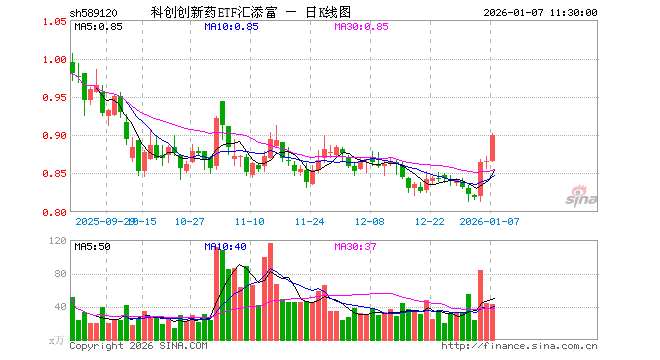 1月7日,截止午间收盘,科创创新药ETF汇添富(589120)涨3.93%,报0.900元,成交额3796.31万元。科创创新药ETF汇添富(589120)重仓股方面,百济神州截止午盘涨3.36%,百利天恒涨3.60%,博瑞医药涨1.84%,君实生物涨3.13%,艾力斯涨1.35%,泽璟制药涨5.37%,荣昌生物涨6.54%,益方生物涨6.86%,特宝生物涨1.97%,迈威生物涨8.97%。