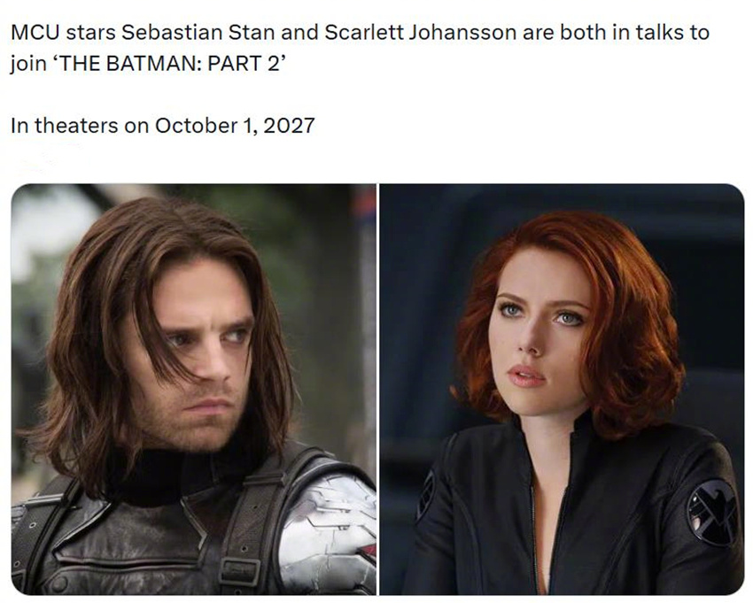384商谈出演新蝙蝠侠2 塞巴斯蒂安·斯坦商谈出演DC新片《新蝙蝠侠2》,目前角色未知(外媒猜测或将出演Harvey Dent),而斯嘉丽·约翰逊此前也被报道商谈出演本片另一未知角色。蹲一个漫威冬寡在DC重聚?.《新蝙蝠侠2》计划今春开拍,导演马特·里夫斯、主演罗伯特·帕丁森回归,定档明年10月1日北美公映。.384出演新蝙蝠侠2 跨年电影愿