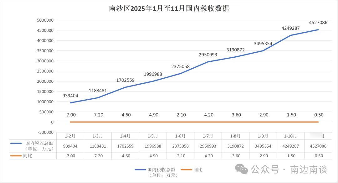 【双15影响?南沙区2025国内税收连续十个月负增长】南沙今年的GDP数据向好,各项经济数据都显示经济在复苏中。但是其中有一项数据连续多个月负增长,在众多数据里面异常显眼,ta就是国内税收总额。 从统计数字可以看到,最夸张应该是上半年,同比竟然是-7%,进入下半年之后才稳定下来,而年底的时候开始回温,即将回正。 根据介绍国内税收总额,是指一定时期内,该地区方位从经济活动中征收的所有税款总和,是衡量该地区财政收入规模的关键指标。和经济指标应该是同向的。但是从南沙公布的数据来看,经济数据在增长,但是税收却在降低,这真的是让人十分的费解。 个人猜测,这可能跟南沙独特总部经济有一定的关系,由于地区GDP数据有时候是算公司总部的,但是部分公司实质性运营并不在南沙,因此产生了差额。 另外南沙的双15税收优惠政策也有不少的影响!在双15政策开始执行之后,南沙部分公司为了可以享受税收优惠,将公司总部搬迁到优惠区。这一换之后,公司依旧还是在南沙,GDP等经济数据没变,但是要交的税变少了,南沙收的税也就随之变少。 不过在相信双15的影响应该是短期的,等大部分公司迁址完毕之后应该就不会有影响了,而且双15对于区外公司也很有吸引力,后续随着陆续引入新公司,税收有望继续回升。