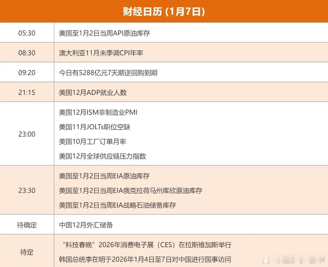 1.7股市早知道:1、外盘汇总:继续涨,道指继续历史新高,如图一。 2、交易提示:无。 3、财经日历:如图二。 4、三大指数:1)大盘:继续看涨2)创指:新目标34703)科创50:先看1500,再看1588 5、重要新闻:1)市场监管总局就《乳制品生产许可审查细则(征求意见稿)》公开征求意见;2)生态环境部:“十五五”时期将推动200个左右城市开展“无废城市”建设;3)水利部:2026年要加快建设现代化水网,夯实农业农村现代化水利基础。 6、市场动态:1)2025年A股新开户数2744万户,同比增10%;2)中证指数:将芯源微调入中证500,华大智造调入中证A500;3)贵州:完善峰谷电价与推动储能参与市场,鼓励工商业配置储能。 7、公司公告:1)金风科技:对蓝箭航天的持股作为非上市权益工具的投资;2)恒宝股份:控股股东钱京拟减持不超3%公司股份;3)东方中科:股东大连金投拟减持不超3%股份;4)盛科通信:第二大股东大基金拟减持不超3%股份;5)利尔化学:2025年净利同比预增113.62%-132.19%;6)三博脑科:目前不涉及脑机接口产品的研发、生产及销售;7)上峰水泥:拟出资9000万元与兰璞创投合作成立私募,投向半导体材料、设备及零部件等硬科技领域;8)药明康德:第三大股东、第四大股东、第六大股东等18家股东2025年11月20日至2026年1月5日期间累计减持2%公司股份。(关注点赞+评论,陪你一起到牛市)今日A股优质财经分享财经