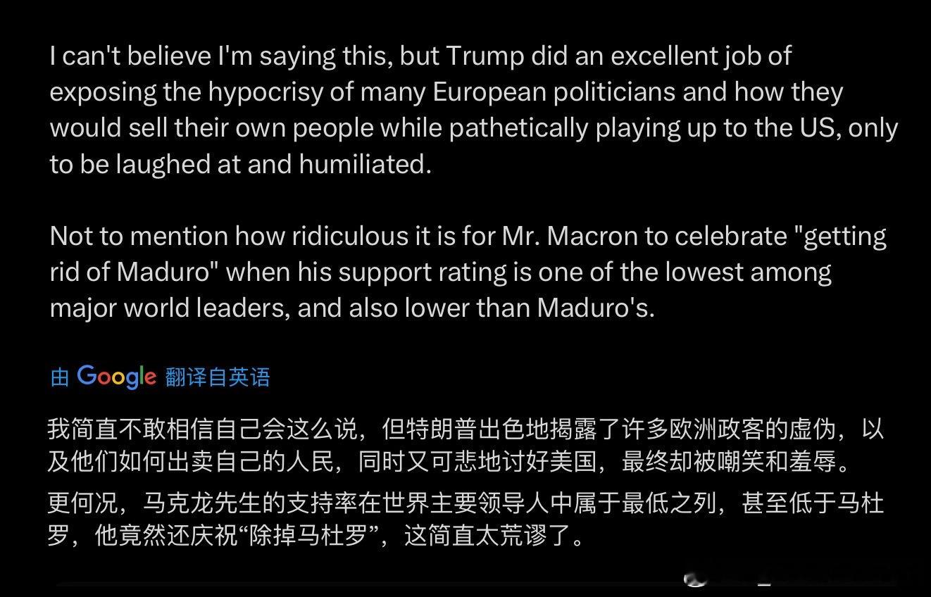 马克龙的表态变了新年伊始就有这么多乐子看简直太精彩了。支持率在全球领导人中垫底,比马杜罗还低的马克龙:“委内瑞拉人民摆脱了马杜罗而欢欣鼓舞,尊重委内瑞拉人民的意愿”;惩罚马克龙纽约徒步的特朗普:“马克龙哀求我说药品涨价200%都可以,但求别告诉法国老百姓”。回旋镖打得啪啪响了属于是。我不敢相信我会说这话,但特朗普真的是一己之力揭穿了欧洲政客的欺软怕硬的虚伪嘴脸,对发展中国家颐指气使,对发达国家唯唯诺诺。管你这那的。