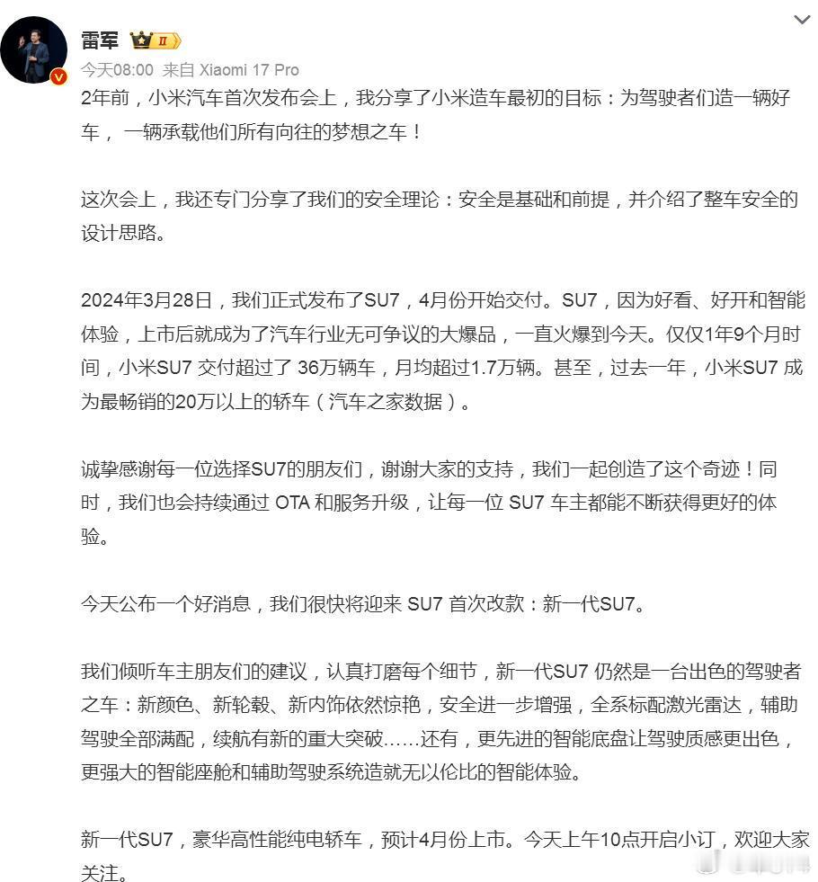 新一代小米SU7,究竟是不是“全新”呢?现在还不好说,根据小道消息,外观是没什么变化的,但是配置会升级不少,比如说标配激光雷达,麒麟二代电池,新的电机,前后排座椅全满配等等。但是最重要的一个,就是门把手多了机械冗余,不再是小按钮了,会有机械机构,确保可以在断电的情况下从外面手动开启。在2025年,小米SU7的成绩非常优秀,能跟特斯拉Model 3平起平坐了,在30万元内基本没有对手,那么2026年的新一代SU7呢,会不会延续这个势头?我们拭目以待!雷军官宣新一代SU7新一代SU7