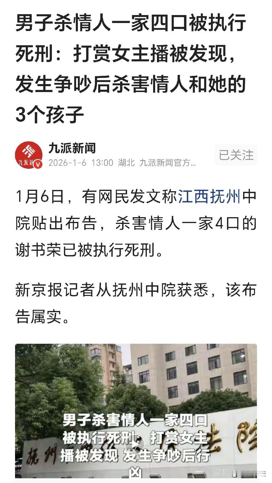 江西抚州,一27岁男子在网上认识39岁女子,女子已经结婚,还有三个孩子,女子不管不顾,很快和男子发生了不正当关系,可女子发现,男子打赏女主播,女子嫉妒,和男子吵了起来,男子拿起铁锤菜刀,将女子和3个孩子全部杀死,大孩16,二孩10岁,最小的才3岁,男子自知罪责难逃,他去自首,以为能够减罪,判决结果大快人心! 谢书荣27岁,他喜欢上网,2024年4月,他和39岁的焦某某在网上相识。 俩人聊了一阵,觉得十分的投机,他们相见恨晚,很快就约了线下见面。 谢书荣年轻气盛,青春的年华很有魅力,焦某某经过修饰,同样显得年轻美丽。 他们相处不久,感情一发不可收拾,很快就突破了防线,俩人发展成了不正当关系。 可焦某某和谢书荣并不相同,她已经结婚生子,她有丈夫,还有3个年幼的孩子。 可焦某某见到谢书荣后,立刻就对他一见钟情,她深陷其中,早就把家庭孩子忘的一干二净。 可时间一长,俩人也闹矛盾,谢书荣向焦某某索要钱财,他要拿来给女主播进行打赏。 焦某某十分的生气,你一个男子自己不去工作,问我要钱,还要去打赏别人? 焦某某坚决不给,谢书荣记恨在心。 2024年10月,谢书荣把二人的关系告诉了焦某某的丈夫,焦某某一气之下,将谢书荣的联系方式全部拉黑。 可谢书荣纠缠不休,他花言巧语又哄骗着焦某某和他和好,焦某某心里一软,又和他恢复了不正当的关系。 2024年12月7日,谢书荣又因为被拉黑之事到焦某某家纠 缠闹事,焦某某报警,谢书荣做出保证,以后不再纠缠焦某某和她的家人。 可是在他的心里,已经暗自打好了算盘。 于是他提前购买了菜 刀 铁 锤,决定对焦某某一家进行报 复,他要杀 害焦某某一家,这事绝不能就这么完了! 2025年1月13日中午1点,谢书荣来到焦某某的家里,焦某某丈夫没在,谢书荣将铁 锤 菜 刀藏到主卧卫生间里。 焦某某的3个孩子,天真可爱,他们在屋子里玩耍,根本不懂得大人之间的事情。 谢书荣在焦某某家里一直待到晚上23点,他又拿出手机,开始看女主播表 演节目。 谢书荣目不转睛,手机上的女主播靠着美 颜,一个个显得美丽无比。 谢书荣忍不住又想要给女主播打赏过去。 他没有发现,焦某某正好看见他想给女主播打赏,焦某某十分的生气。 她大喊大叫,和谢书荣发生了争吵。 谢书荣立刻跑到卫生间里,拿出了事先准备好的铁 锤和菜 刀,一锤就砸到焦某某脸上。 他又拿起菜刀将将焦某某活活 砍 死,之后他又朝3个孩子走去。 焦某某的3个孩子,大的16岁,老二10岁,最小的只有3岁,他们无辜,也被谢书荣全部杀 害。 谢书荣手段残 忍,作案后就仓促逃走,焦某某家里装有监控,丈夫查监控时,发现家里没有动静。 可监控里的画面异常,丈夫心里一阵恐慌,他觉得不对劲了,立刻报警。 谢书荣仓皇逃走,可他越想越怕,这可是四条人命啊,他绝对是跑不了的。 于是,他主动报警,如实交代了自己的罪行,他暗自以为,自己有自首情节,也许会被减轻罪行。 可他没有想到,他作 恶 多端,手段残 忍,在他行 凶的时候,早就已经没了底线。 这本来就是一段不道 德的婚外感情,如果谢书荣厌倦了焦某某,他完全可以离开。 可是他又贪图焦某某的钱财,不给钱就和焦某某没完。 焦某某不顾丈夫,不顾家庭,她有错处,她有问题,但是她罪 不 至 死。 谢书荣手段残 忍,因为索要不出钱财,就心生歹 意,一连伤了四条人 命! 老话说的一点没错,自古间情出人命。 焦某某不顾家庭,结果不但自己被害,还牵连到了三个孩子,孩子们太可怜了。 《刑法》第232条规定:故意杀人的,处死刑、无期徒刑或者十年以上有期徒刑;情节较轻的,处三年以上十年以下有期徒刑。 谢书荣连续杀害焦某某及三名未成年子女,分别为16岁、10岁、3岁。 谢书荣手段残 忍,预先准备铁 锤、菜 刀等X器,对无反抗能力的幼童,甚至3岁幼儿都不放过。 谢书荣主观上故意杀人,造成焦某某母子四人死亡,远超一般杀人案的V害后果。 《刑法》第67条第1款规定: 犯罪后自动投案,如实供述自己罪行的,是自首。对于自首的犯罪分子,可以从轻或者减轻处罚。 《关于常见犯罪的量刑指导意见》:对犯罪动机特别卑 劣、手段特别残 忍、后果特别严重的案件,即使有自首情节也可不予从轻。 谢书荣作案后主动投案,并供述罪行,形式上符合自首条件。 但是,谢书荣罪行极端严重,他杀害四人,包含3名未成年人,V害极大。 并且,谢书荣是事先准备好了铁 锤 菜 刀,是有预谋并主动杀害了谢某某母子四人,他罪大恶 极,绝对不可饶恕。 因此,法院认为,谢书荣的自首情节不足以轻判,法院以故意杀人罪判处谢书荣死刑。 2025年12月31日,谢书荣被押至刑场,验明正身,执行了死刑。 关注@王哥说法 多学法律少吃亏!