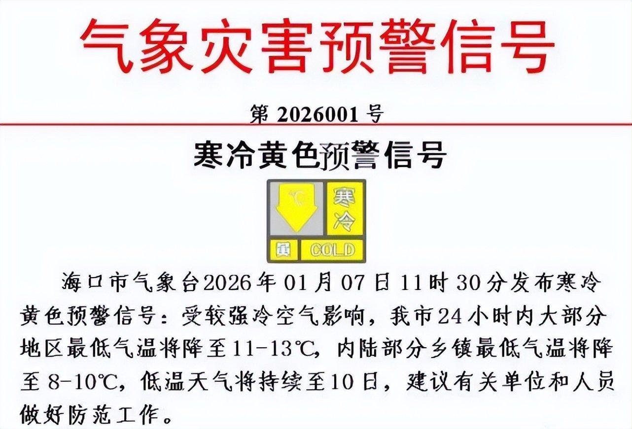 受较强冷空气影响,海口市24小时内大部分地区最低气温将降至11~13℃,内陆部分乡镇最低气温将降至8~10℃,低温天气将持续至10日,建议有关单位和人员做好防范工作。