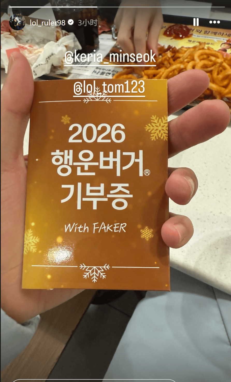 虎扑01月07日讯Ruler更新社媒动态,他、Keria和教练Tom三人一起去吃Faker与麦当劳合作的幸运汉堡。