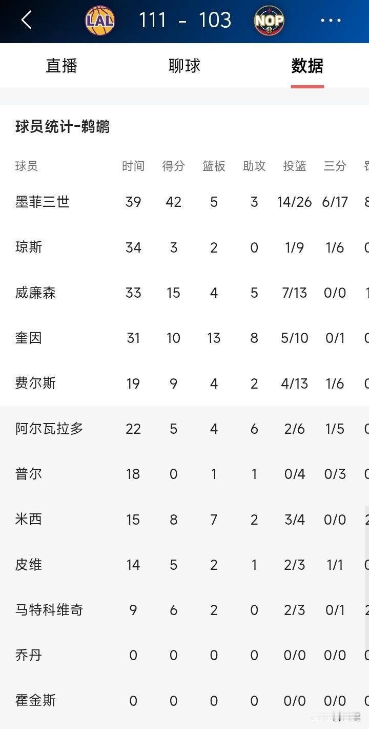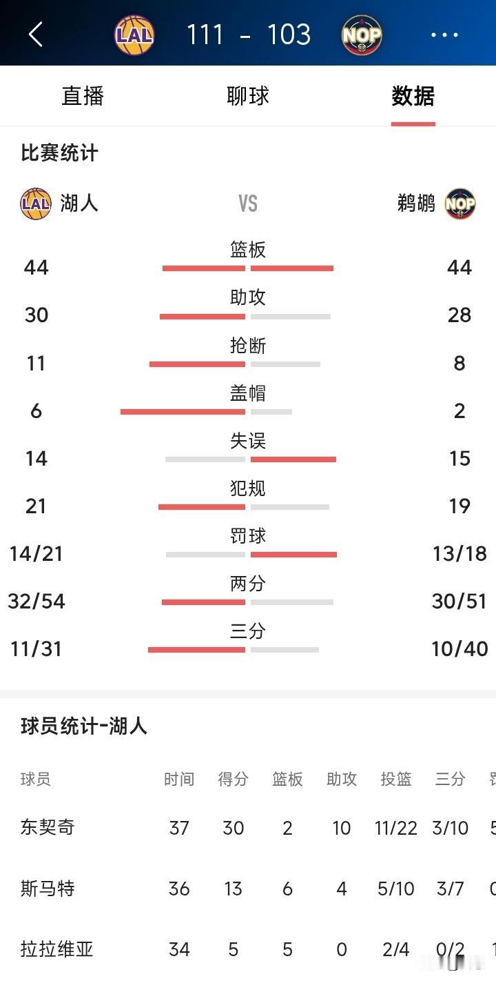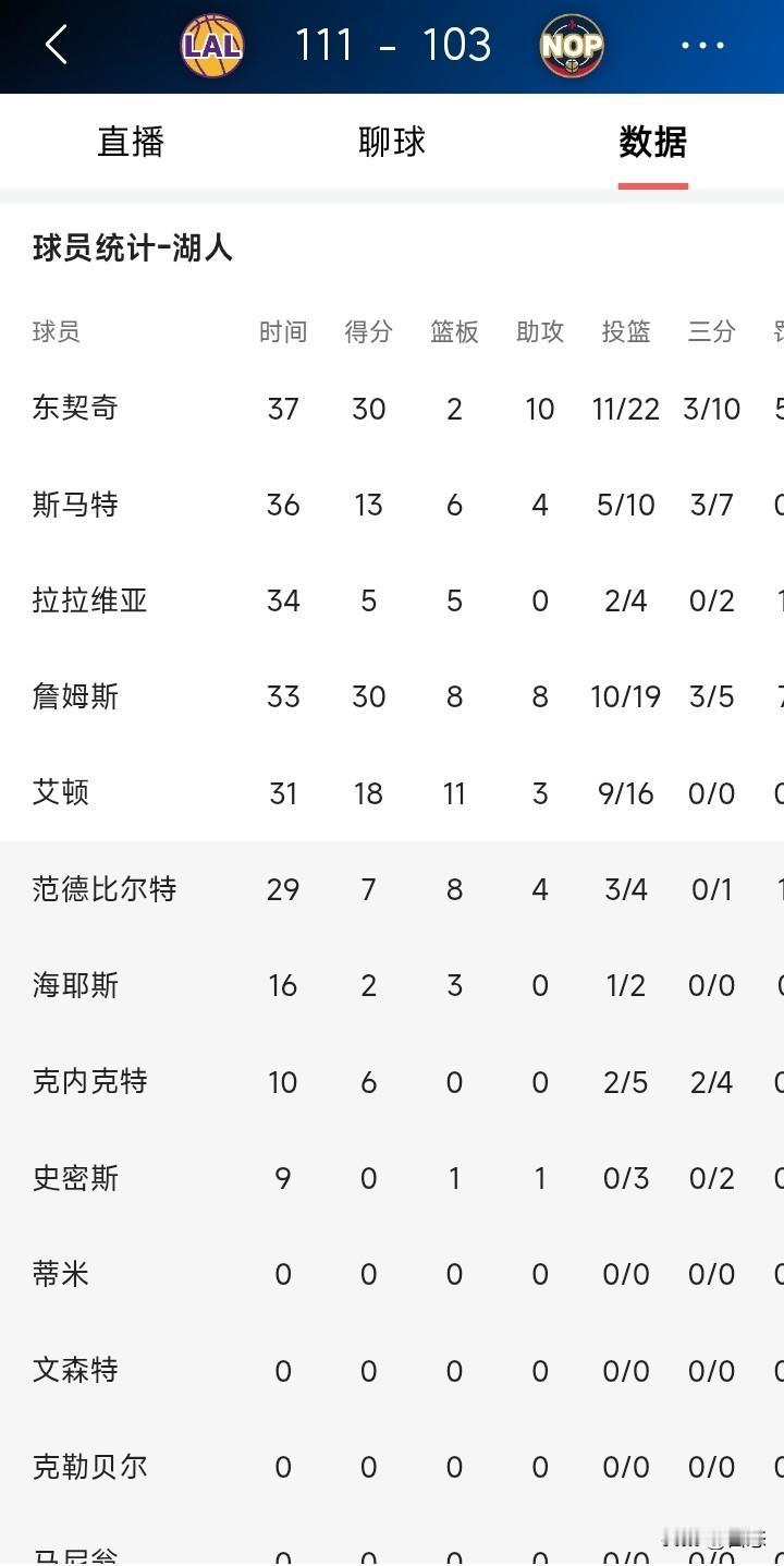湖人客场挑战鹈鹕,湖人111比103鹈鹕大胜对手。不敢相信的事,詹姆斯居然拿了30分,一位41岁的老将,还能拿30分,那画面不敢想象啊!有人说詹姆斯都40多岁了,还不退役。年轻人怎么提升! 说实话,竞技体育,是拿实力说话,不是年轻就行的。詹姆斯那身体一般人都很难对抗吧? 你们怎么看詹姆斯数据呢?