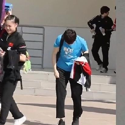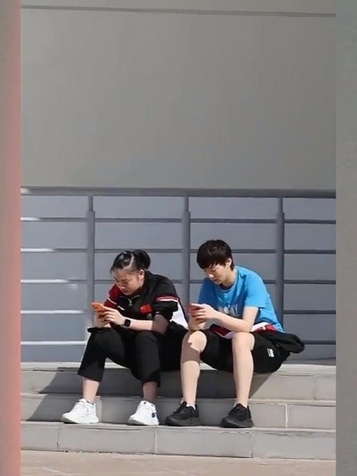 1月7日中午,曼昱和徐奕走出训练场,她身边的工作人员拿个文件夹遮挡太阳。 多哈的冬天像夏天一样,外面的太阳好大,晒的曼昱眼睛睁不开,只有低着头走。天气太热了,曼昱把裤子腿往上拉拉,或许要凉快些。 太热了,曼昱示意徐奕走到水泥台阶边,两个人停下来,曼昱把裤脚卷的高高的,露出大长腿,姐妹俩坐在台阶上刷手机,过会儿曼昱把手机塞进口袋,和过往的队友笑着打招呼,曼昱的心情极好,美美哒! 徐奕自从坐下来一直刷手机,曼昱不忍打扰她,没有队友走过的时候,曼昱则弓着身子低着头,把手撑在腿上,静静的放松心情。