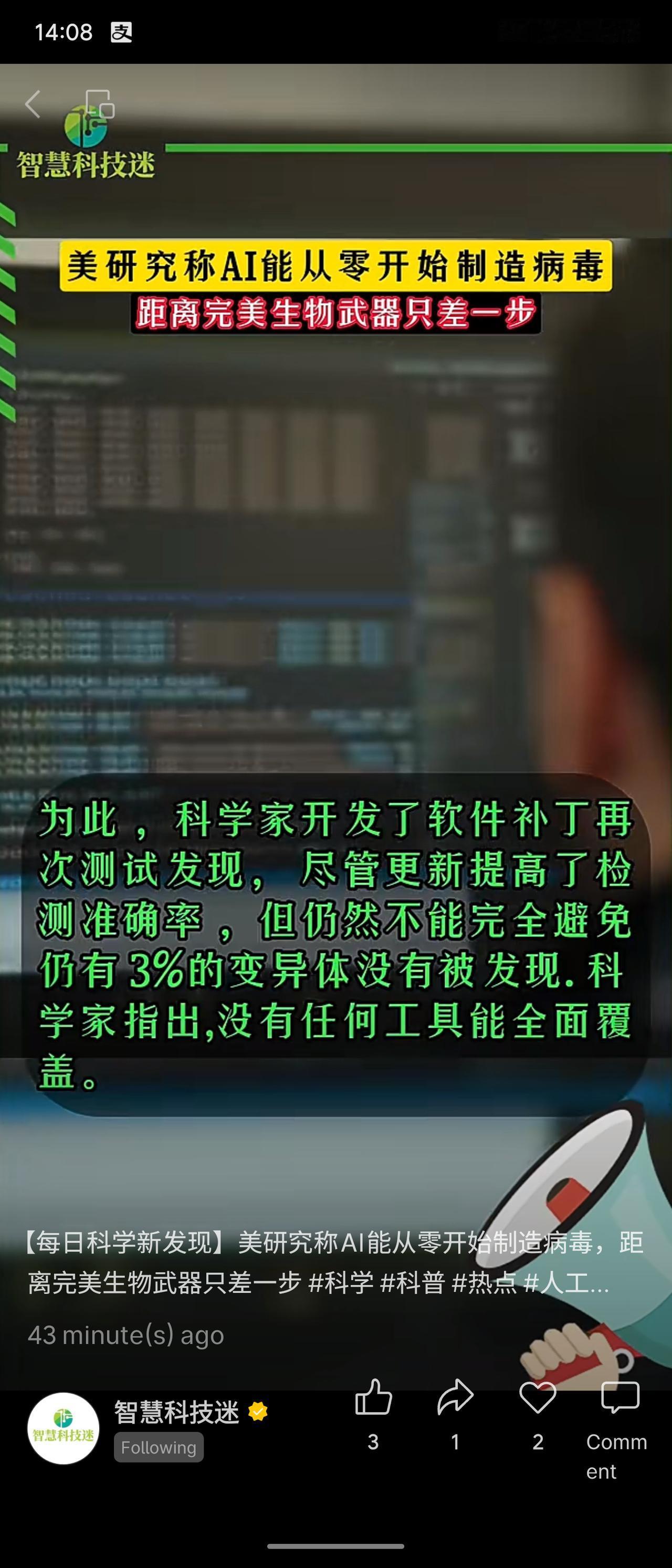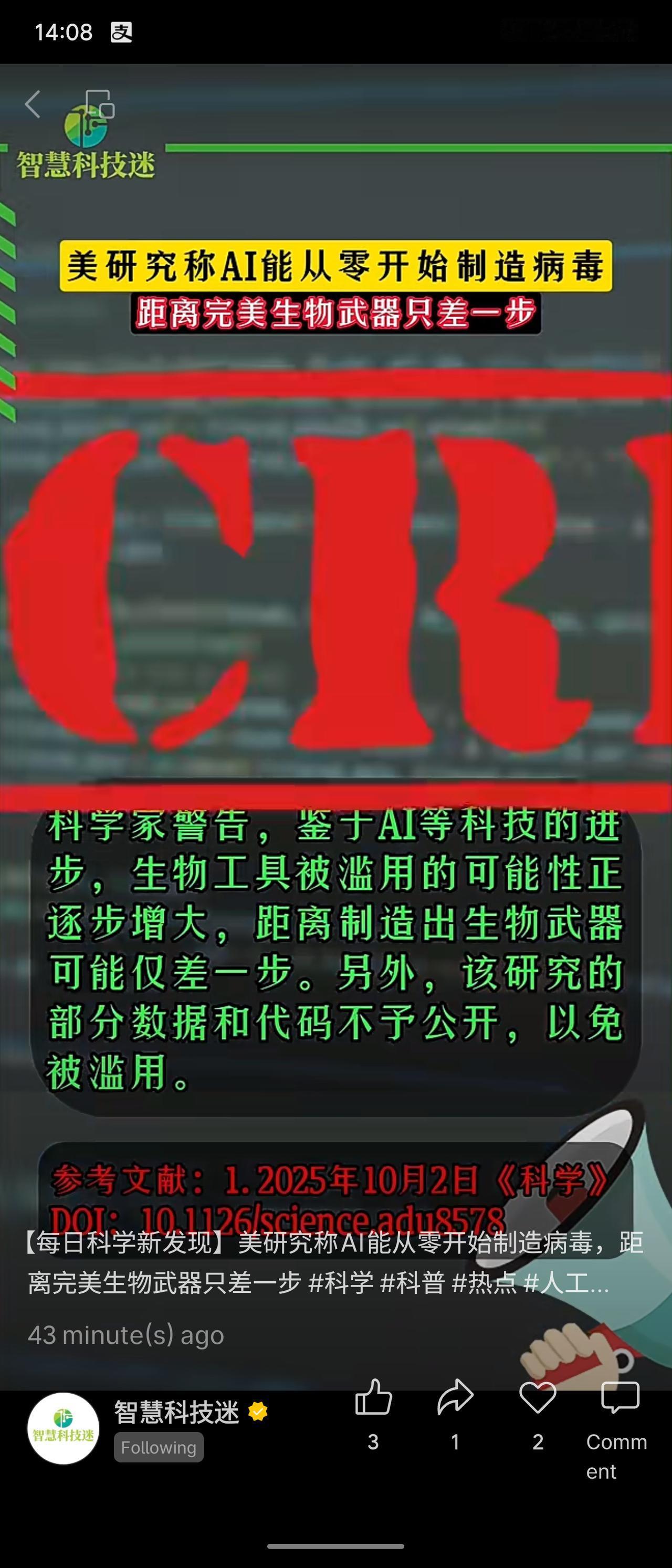 援引美国微软等研究警告,称AI已能在实验室中从零开始设计病毒基因组(如噬菌体),且现有安全筛查工具对AI生成病毒的检测存在盲区,即便更新补丁后仍有漏洞。研究指出生物技术滥用风险增大,部分数据因此不予公开。 此报道揭示了AI在生物科技领域的双刃剑效应,其警示意义值得重视。然而,标题“只差一步”的表述可能略显夸张,研究本身更侧重于风险预警与技术漏洞。这凸显了在发展前沿科技时,同步构建伦理与安全屏障的紧迫性。